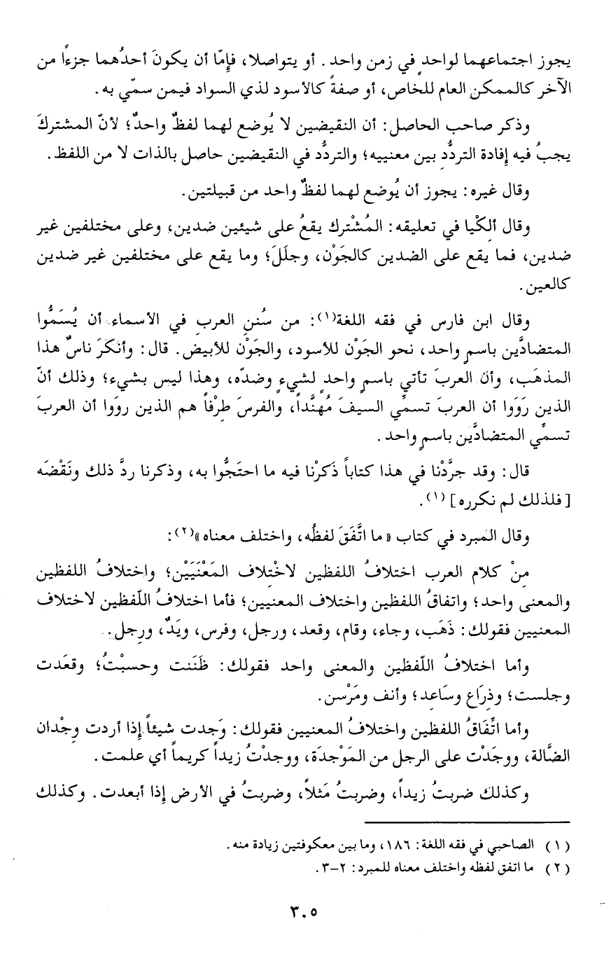 قال: وأنكرَ ناسٌ هذا المذهَب وأن العربَ تأتي باسم واحد لشيء وضده وهذا ليس بشيءوذلك أن الذين رَوَوا أن العربَ تسمِّي السيفَ مهنداوالفرس طِرْفاً هم الذين روَوا أن العربَ تسمِّي المتضادَّين باسمٍ واحد.