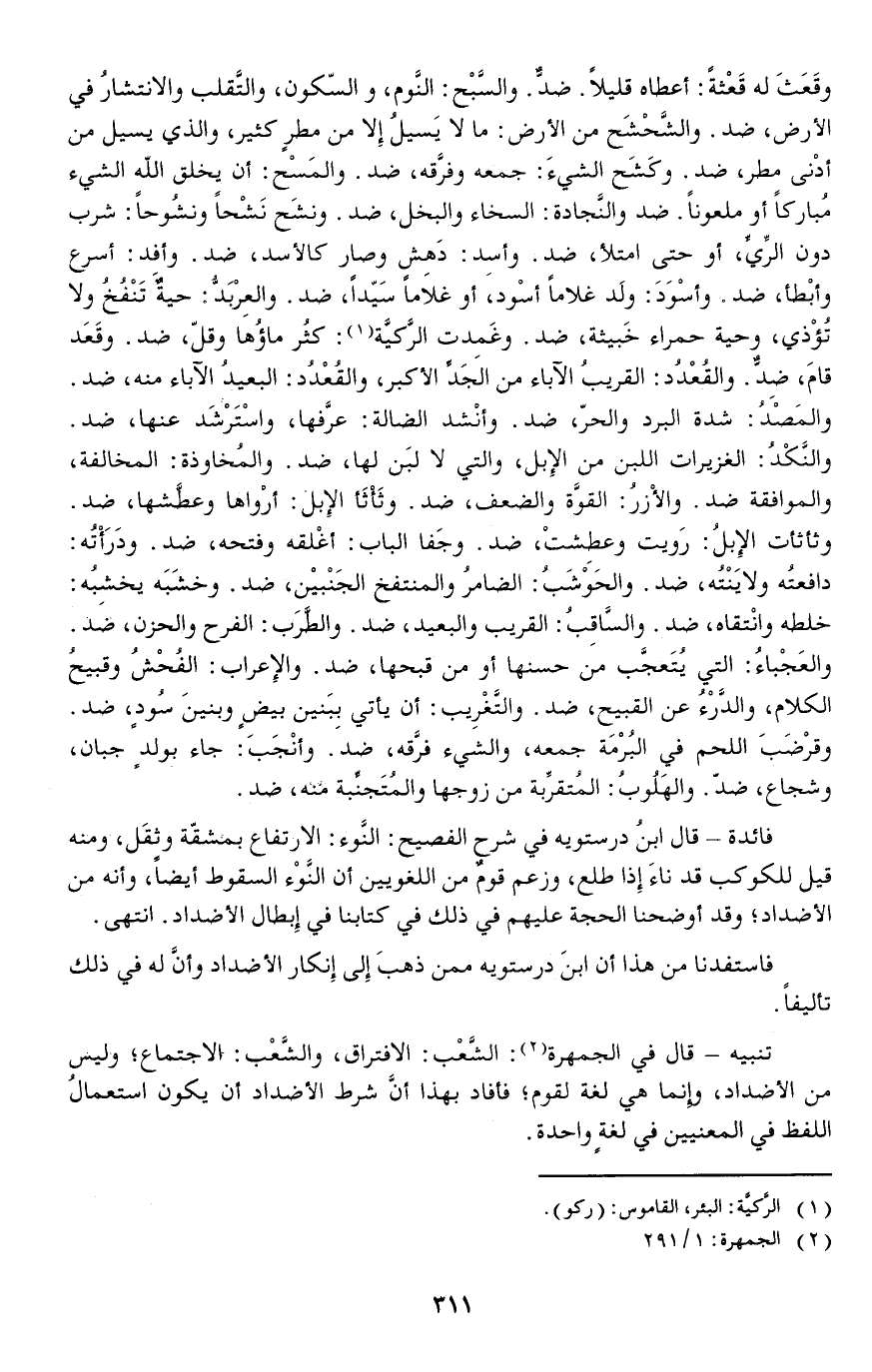 فاستفدنا من هذا أن ابنَ درستويه ممن ذهبَ إلى إنكار الأضداد وأنَّ له في ذلك تأليفا.