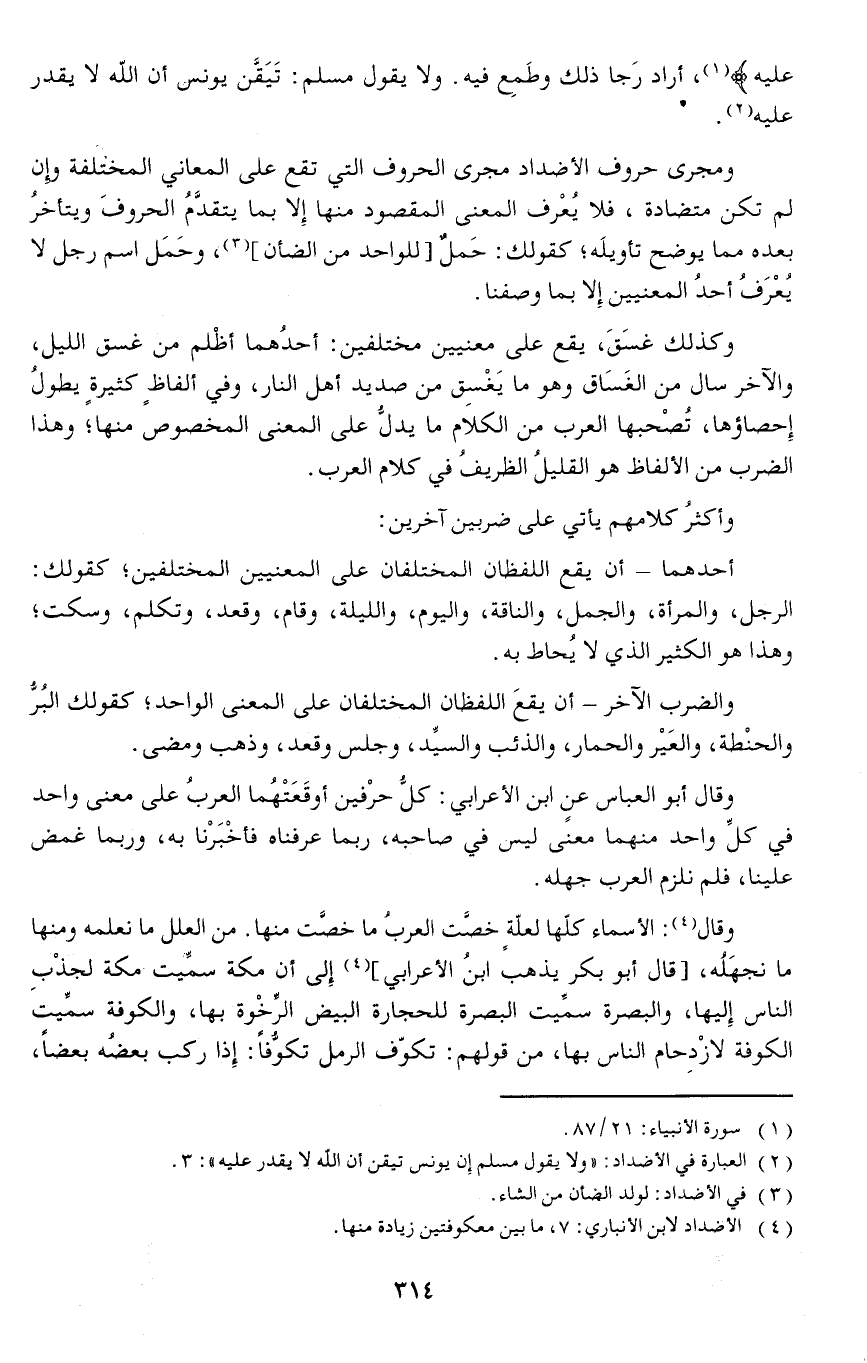 ومجرى حروف الأضداد مجرى الحروف التي تقع على المعاني المختلفة وإن لم تكن متضادة فلا يُعْرف المعنى المقصود منها إلا بما يتقدَّمُ الحروفَ ويتأخرُ بعده مما يوضح تأويلهكقولك: حَملٌ (للواحد من الضأن) وحَمَل اسم رجل لا يُعْرَفُ أحدُ المعنيين إلا بما وصفنا.
