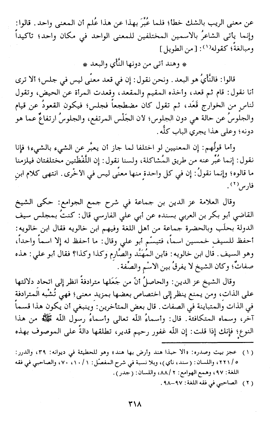 وقال العلامة عز الدين بن جماعة في شرح جمع الجوامع: حكى الشيخ القاضي أبو بكر بن العربي بسنده عن أبي علي الفارسي قال: كنتُ بمجلس سيف الدولة بحلَب وبالحضرة جماعة من أهل اللغة وفيهم ابن خالويه فقال ابن خالويه: أحفظ للسيفِ خمسين اسمافتبسم أبو علي وقال: ما احفظ له إلا اسما واحداوهو السيف. قال ابن خالويه: فأين المُهَنَّد والصَّارِم وكذا وكذافقال أبو علي: هذه صفاتوكأن الشيخ لا يفرقُ بين الاسْمِ والصِّفة.