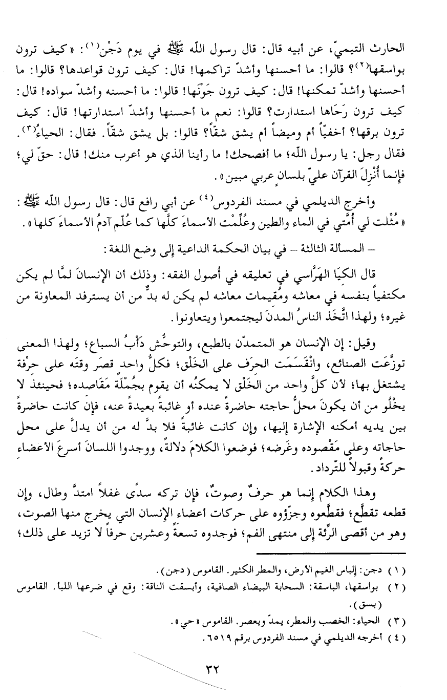 وقيل: إن الإنسان هو المتمدن بالطبع والتوحُّش دَأْبُ السباع ولهذا المعنى توزَّعَت الصنائع وانْقَسَمَت الحِرَف على الخَلْق فكلُّ واحدٍ قصَر وقتَه على حِرْفة يشتغل بها لأن كلَّ واحد من الخَلْق لا يمكنُه أن يقوم بجُمْلَة مَقَاصِده فحينئذ لا يخْلُو من أن يكونَ محلُّ حاجته حاضرة عنده أو غائبة بعيدة عنه فإن كانت حاضرة بين يديه أمكنه الإشارة إليها وإن كانت غائبة فلا بدَّ له من أن يدلَّ على محل حاجاته وعلى مَقْصوده وغَرضه فوضعوا الكلامَ دلالة ووجدوا اللسانَ أسرعَ الأعضاءِ حركة وقبولا للترداد.