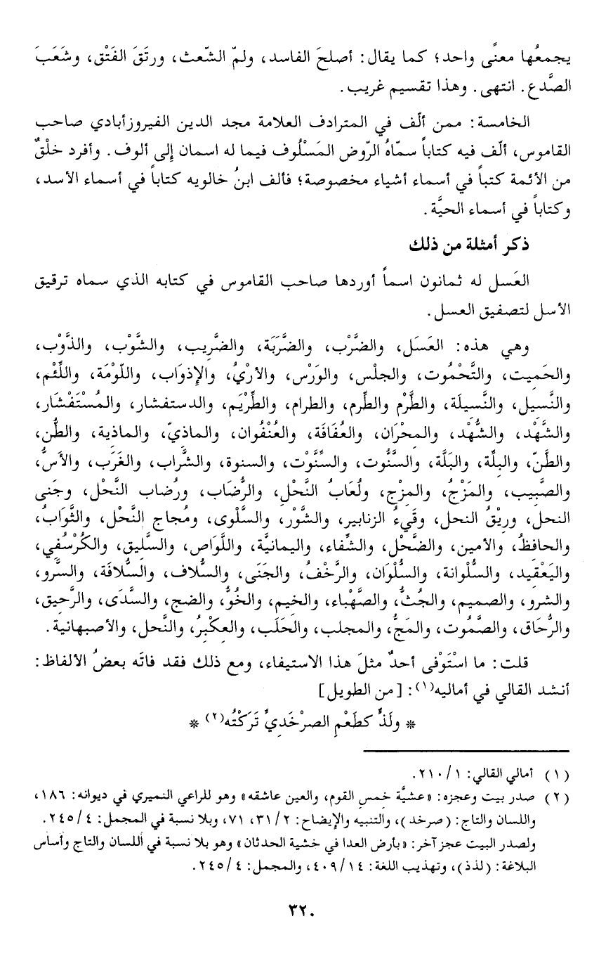 وهي هذه: العَسَل والضَّرْب والضَّرَبَة والضَّرِيب والشَّوْب والذَّوْب والحَمِيت والتَّحْمُوت والجلْس والوَرْس والأرْيُ والإذوَاب واللّوْمَة واللِّئْم والنَّسِيل والنَّسِيلَة والطَّرْم والطِّرم والطرام والطِّرْيَم والدستفشار والمُسْتَفْشَار والشَّهْد والشُّهْد والمِحْرَان والعُفَافَة والعُنْفُوان والماذِيّ والماذِية والطُّن والطَّنّ والبِلِّة والبَلَّة والسَّنُّوت والسِّنَّوْت والسنوة والشَّراب والغَرَب والأَسُّ والصَّبِيب والمَزْجُ والمِزْج ولُعَابُ النَّحْلِ والرُّضَاب ورُضاب النَّحْل وجَنى النحل ورِيْقُ النحل وقَيءُ الزنابير والشَّوْر والسَّلْوى ومُجاج النَّحْل والثَّوَابُ والحافِظُ والأمين والضَّحْل والشِّفاء واليمانيَّة واللَّوَاص والسَّلِيق والكُرْسُفِي واليَعْقِيد والسُّلْوانة والسُّلْوَان والرَّخْفُ والجَنَى والسُّلاف والسُّلافَة والسَّرو والشرو والصميم والجُثُّ والصَّهْباء والخِيم والخُوُّ والضج والسَّدَى والرَّحِيق والرُّحَاق والصَّمُوت والمَجُّ والمجلب والحَلَب والعِكْبِرُ والنَّحل والأصبهانية.