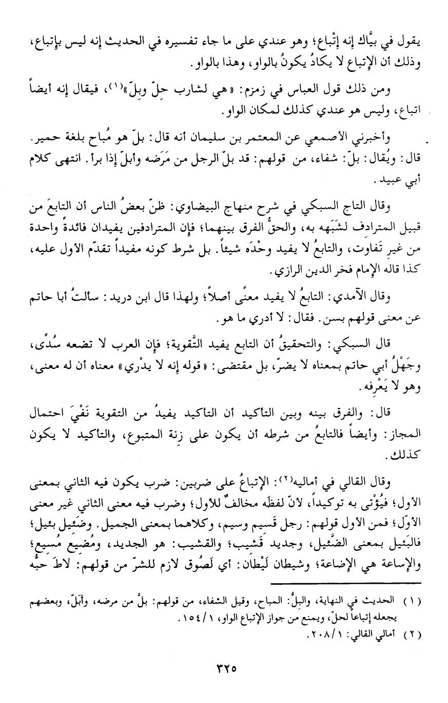 وقال القالي في أماليه: الإتباعُ على ضربين: ضرب يكون فيه الثاني بمعنى الأولفيؤتى به توكيدالأن لفظه مخالف للأولوضرب فيه معنى الثاني غير معنى الأولفمن الأول قولهم: رجل قَسِيم وسيم وكلاهما بمعنى الجميل.