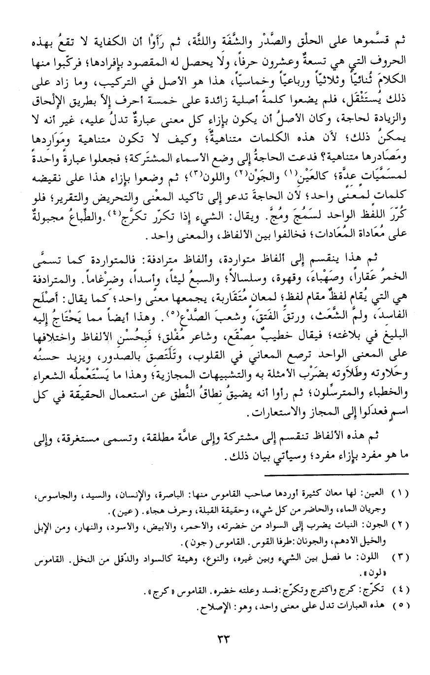 ثم قسَّموها على الحلْق والصَّدْر والشَّفَةِ واللثَّة ثم رَأَوْا أن الكفاية لا تقعُ بهذه الحروف التي هي تسعةٌ وعشرون حرفا ولا يحصل له المقصود بإفرادها فركبوا منها الكلامَ ثُنائيّاً وثلاثيا ورباعيا وخماسيا هذا هو الأصل في التركيب وما زاد على ذلك يُستَثْقَل فلم يضعوا كلمة أصلية زائدة على خمسة أحرف إلا بطريق الإلْحاق والزيادة لحاجة وكان الأصلُ أن يكون بإزاءِ كل معنى عبارةٌ تدلُ عليه غير أنه لا يمكنُ ذلك لأَن هذه الكلمات متناهيةٌ وكيف لا تكون متناهية ومَوَارِدها ومَصَادرها متناهية فدعت الحاجةُ إلى وضع الأسماء المشتَركة فجعلوا عبارة واحدة لمسَمَّيَاتٍ عِدَّة كالعَيْنِ والجَوْن واللون ثم وضعوا بإزاء هذا على نقيضه كلماتٍ لمعنى واحد لأن الحاجةَ تدعو إلى تأكيد المعْنى والتحريض والتقرير فلو كُرّرَ اللفظ الواحد لسَمُجَ ومُجَّ.