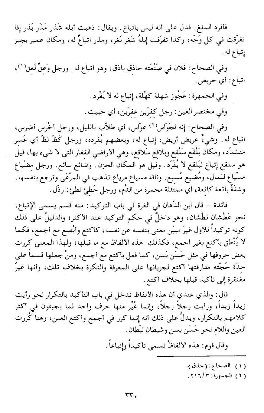 فائدة - قال ابن الدهان في الغرة في باب التوكيد: منه قسم يسمى الإتباع نحو عَطْشان نطْشان وهو داخلٌ في حكم التوكيد عند الأكثر والدليلُ على ذلك كونه توكيدا للأول غيرَ مبين معنى بنفسه عن نفسه كأكتع وأبْصع مع أجمع فكما لا يُنْطق بأكتع بغير أجمع فكذلك هذه الألفاظ مع ما قبلهاولهذا المعنى كررت بعض حروفها في مثل حَسَن بَسن كما فعل بأكتع مع أجمع ومنْ جعلها قسما على حِدَة حُجّته مفارقتها أكتع لجريانها على المعرفة والنكرة بخلاف تلك وأنها غيرُ مفتقرة إلى تأكيد قبلها بخلاف أكتع.