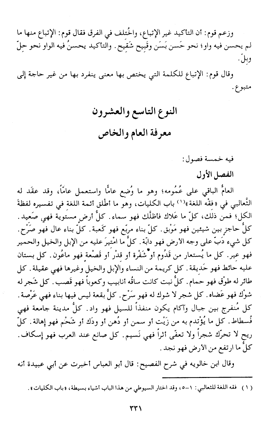 العام الباقي على عمومهوهو ما وضع عاما واستعمل عاماوقد عقَد له الثَّعالبي في (فِقْه اللغة) باب الكليات وهو ما أطْلق أئمة اللغةِ في تفسيره لفظة الكلفمن ذلك كل ما عَلاك فأظلَّك فهو سماء.