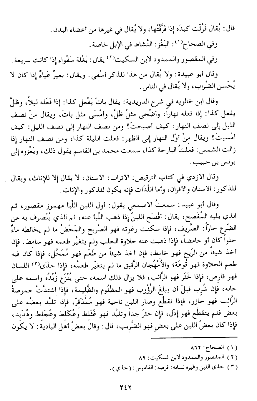وقال أبو عبيد: سمعتُ الأصمعي يقول: أو اللبن اللِّبأ مهموز مقصور ثم الذي يليه المُفْصح يقال: أفْصَح اللبنُ إذا ذهب اللِّبأ عنه ثم الذي يُنْصرف به عن الضرع حارا: الصَّريف فإذا سكنت رغوته فهو الصَّريح والمَحْضُ ما لم يخالطه ماءٌ حلوا كان أو حامضا فإذا ذهبت عنه حلاوة الحلب ولم يتغيَّر طعمه فهو سامِط.