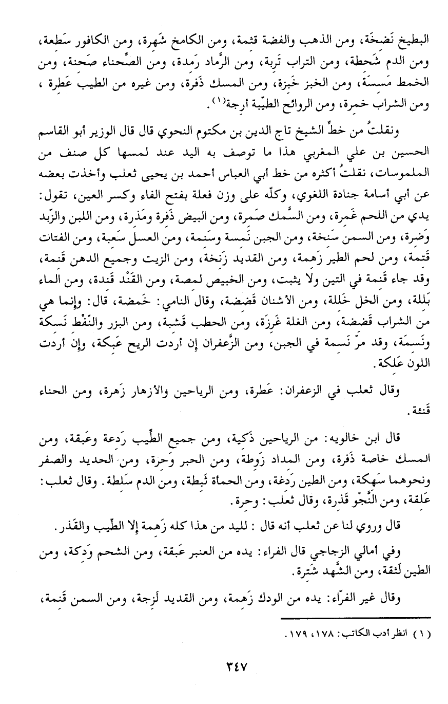 ونقلتُ من خطِّ الشيخ تاج الدين بن مكتوم النحوي قال قال الوزير أبو القاسم الحسين بن علي المغربي هذا ما توصف به اليد عند لمسها كل صنف من الملموسات نقلتُ أكثره من خط أبي العباس أحمد بن يحيى ثعلب وأخذت بعضه عن أبي أسامة جنادة اللغوي وكله على وزن فعلة بفتح الفاء وكسر العين تقول: يدي من اللحم غَمِرة ومن السَّمك صَمِرة ومن البيض ذَفِرة ومَذِرة ومن اللبن والزبد وَضِرة ومن السمن سَنِخة ومن الجبن نَمِسة وسَنِمة ومن العسل سَعِبة ومن الفتات قَتِمة ومن لحم الطير زَهِمة ومن القديد زَنِخة ومن الزيت وجميع الدهن قَنِمة وقد جاء قَنِمة في التين ولا يثبت ومن الخبيص لِمصة ومن القَنْد قَنِدة ومن الماء بَلِلة ومن الخل خَلِلة ومن الأشنان قَضِضة وقال النامي: خَمضة قال: وإنما هي من الشراب قَضِضة ومن الغلة غَرِزَة ومن الحطب قَشِبة ومن البزر والنفط نسكة ونسمة وقد مر نَسِمة في الجبن ومن الزَّعفران إن أردت الريح عَبِكة وإن أردت اللون عَلِكة.