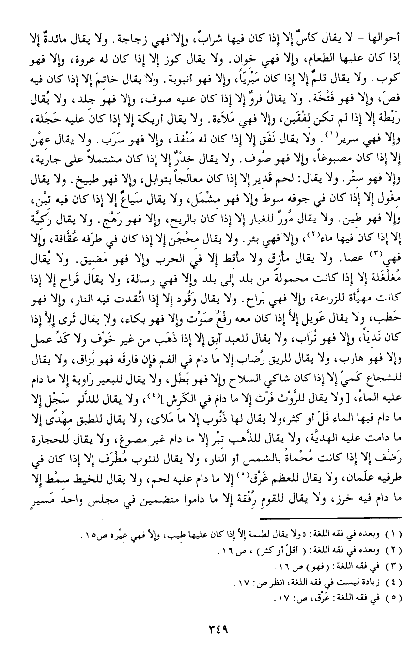 ولا يقال وقود إلا إذا اتقدت فيه النار وإلا فهو حطب ولا يقال عَويل إلاَّ إذا كان معه رفع صوت وإلا فهو بكاءولا يقال ثرى إلا إذا كان ندياوإلا فهو تُرَاب ولا يقال للعبد آبِق إلا إذا ذَهَب من غير خَوْف ولا كَدِّ عمل وإلا فهو هارب ولا يقال للريق رُضاب إلا ما دام في الفم فإن فارقَه فهو بُزاق ولا يقال للشجاع كَمىّ إلا إذا كان شاكي السلاح وإلا فهو بَطل ولا يقال للبعير رَاوية إلا ما دام عليه الماءُ (ولا يقال للرَّوْث فَرْث إلا ما دام في الكَرِش) ولا يقال للدَّلو سَجْل إلا ما دام فيها الماء قَلّ أو كثر ولا يقال لها ذَنُوب إلا ما مَلأى ولا يقال للطبق مِهْدًى إلا ما دامت عليه الهديَّة ولا يقال للذَّهب تِبْر إلا ما دام غير مصبوغ ولا يقال للحجارة رَضْف إلا إذا كانت مُحْماةً بالشمس أو النار ولا يقال للثوب مُطْرَف إلا إذا كان في طرفيه علَمان ولا يقال للعظم غَرْق إلا ما دام عليه لحم ولا يقال للخيط سِمْط إلا ما دام فيه خرز ولا يقال للقومِ رُفَقْة إلا ما داموا منضمين في مجلس واحد مسير