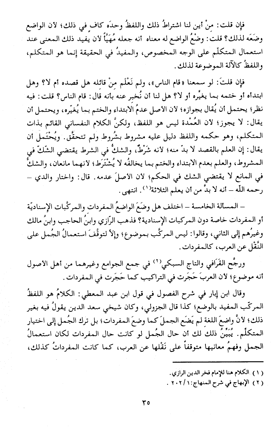 - المسألة الخامسة - اختلف هل وضَعَ الواضعُ المفرداتِ والمركَّبات الإسنادية أو المفردات خاصة دون المركبات الإسنادية فذهب الرازي وابنُ الحاجب وابنُ مالك وغيرُهم إلى الثاني وقالوا: ليس المركَّب بموضوع وإلا لتوقَّفَ استعمالُ الجُمل على النَّقْل عن العرب كالمفردات.