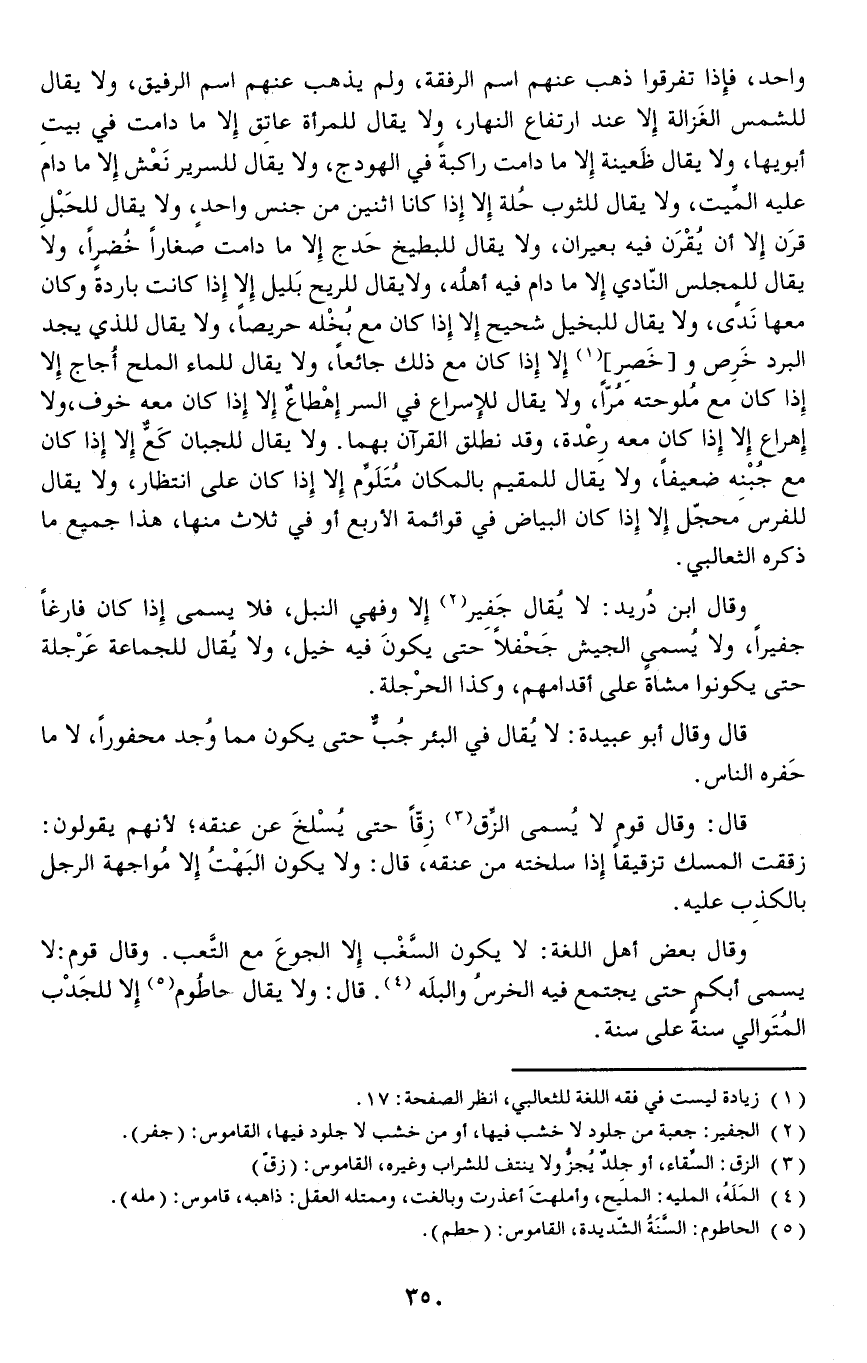 واحد فإذا تفرقوا ذهب عنهم اسم الرفقة ولم يذهب عنهم اسم الرفيق ولا يقال للشمس الغَزالة إلا عند ارتفاع النهار ولا يقال للمرأة عاتِق إلا ما دامت في بيت أبويها ولا يقل ظعينة إلا ما دامت ركبة في الهودج ولا يقال للسرير نَعْش إلا ما دام عليه المِّيت ولا يقال للثوب حُلة إلا إذا كانا اثنين من جنس واحدٍ ولا يقال للحَبْلِ قرَن إلا أن يُقْرَن فيه بعيران ولا يقال للبطيخ حَدج إلا ما دامت صغارا خضراولا يقال للمجلس النادي إلا ما دام فيه أهلُه ولا يقال للريح بَليل إلا إذا كانت باردة وكان معها نَدًى ولا يقال للبخيل شحيح إلا إذا كان مع بُخْله حريصاولا يقال للذي يجد البرد خرص و (خصر) إلا إذا كان مع ذلك جائعاولا يقال للماء الملح أُجاج إلا إذا كان مع ملوحته مراولا يقال للإسراع في السر إهْطاعٌ إلا إذا كان معه خوف ولا إهراع إلا إذا كان معه رِعْدة وقد نطلق القرآن بهما.