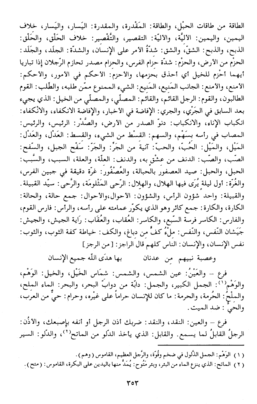 فرع - والعَيْنُ: عين الشمس والشمس: شِمَاس الخَيْل والخيل: الوَهْم والوَهْم: الجمل الكبير والجمل: دابة من دوابُ البحر والبحر: الماء الملح والملح: الحرمة والحرمة: ما كان فلإنسان حراما على غيْره وحرام: حيٌّ من العرب والحيُّ: ضد الميت.