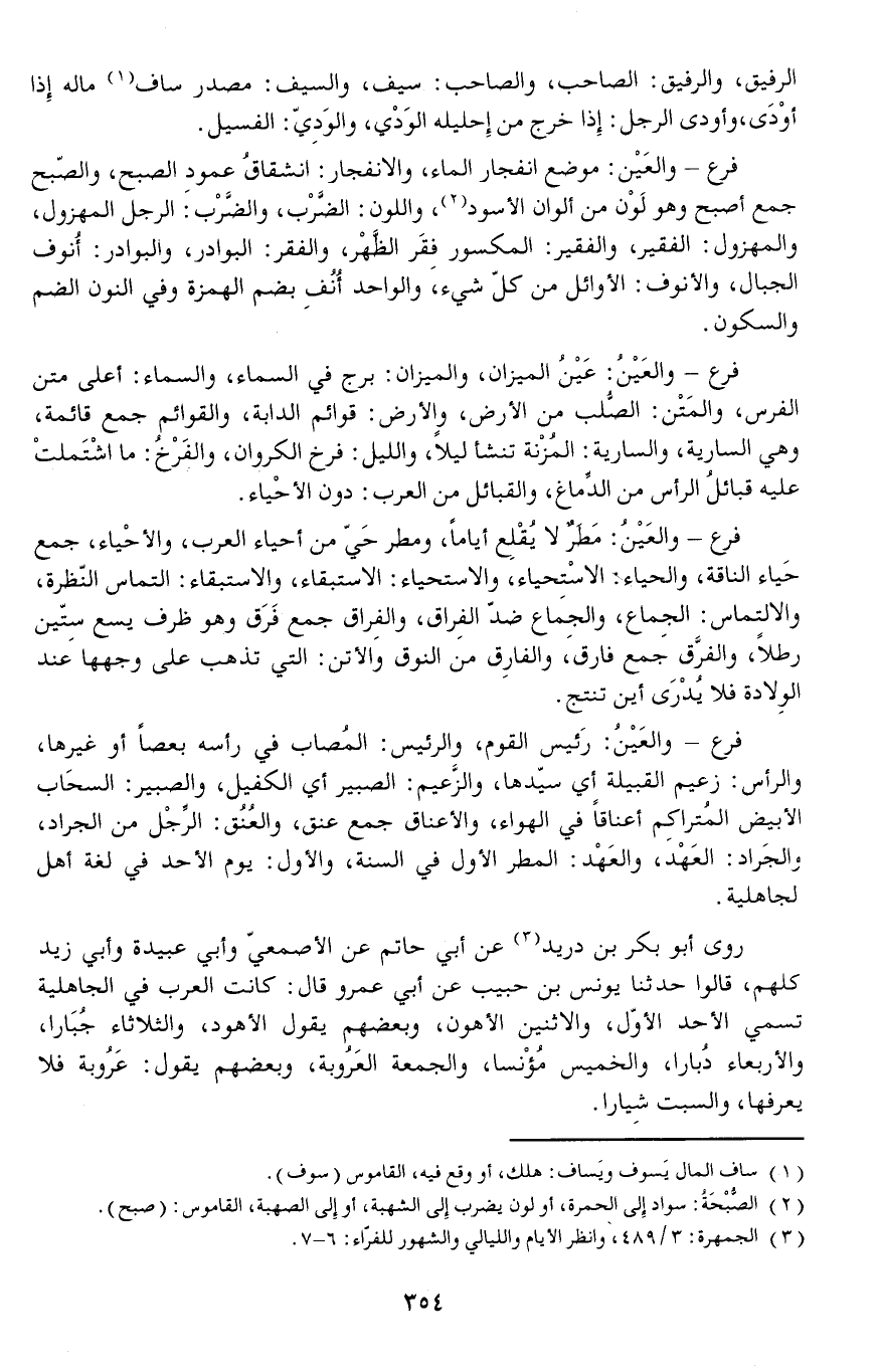 فرع - والعَيْنُ: رَئيس القوم والرئيس: المُصاب في رأسه بعصا أو غيرها والرأس: زعيم القبيلة أي سيدها والزَّعيم: الصبير أي الكفيل والصبير: السحَاب الأبيض المُتراكِم أعناقا في الهواء والأعناق جمع عنق والعُنقُ: الرِّجْل من الجراد والجَراد: العَهْد والعَهْد: المطر الأول في السنة والأول: يوم الأحد في لغة أهل لجاهلية.