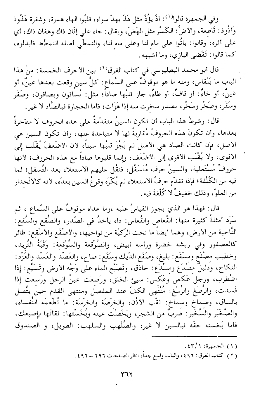 قال أبو محمد البطليوسي في كتاب الفرق بين الأحرف الخمسة: مِنْ هذا الباب ما يَنْقاس ومنه ما هو موقوفٌ على السِّماع: كلُّ سينٍ وقعت بعدها عين أو غين أو خاء: أو قاف أو طاءجاز قلبها صادامثل: يُساقون ويصاقون وصَقْر وسَقْر وصَخْر وسَخْر مصدر سخرت منه إذا هزأتفأما الحجارة فبالصَّاد لا غير.