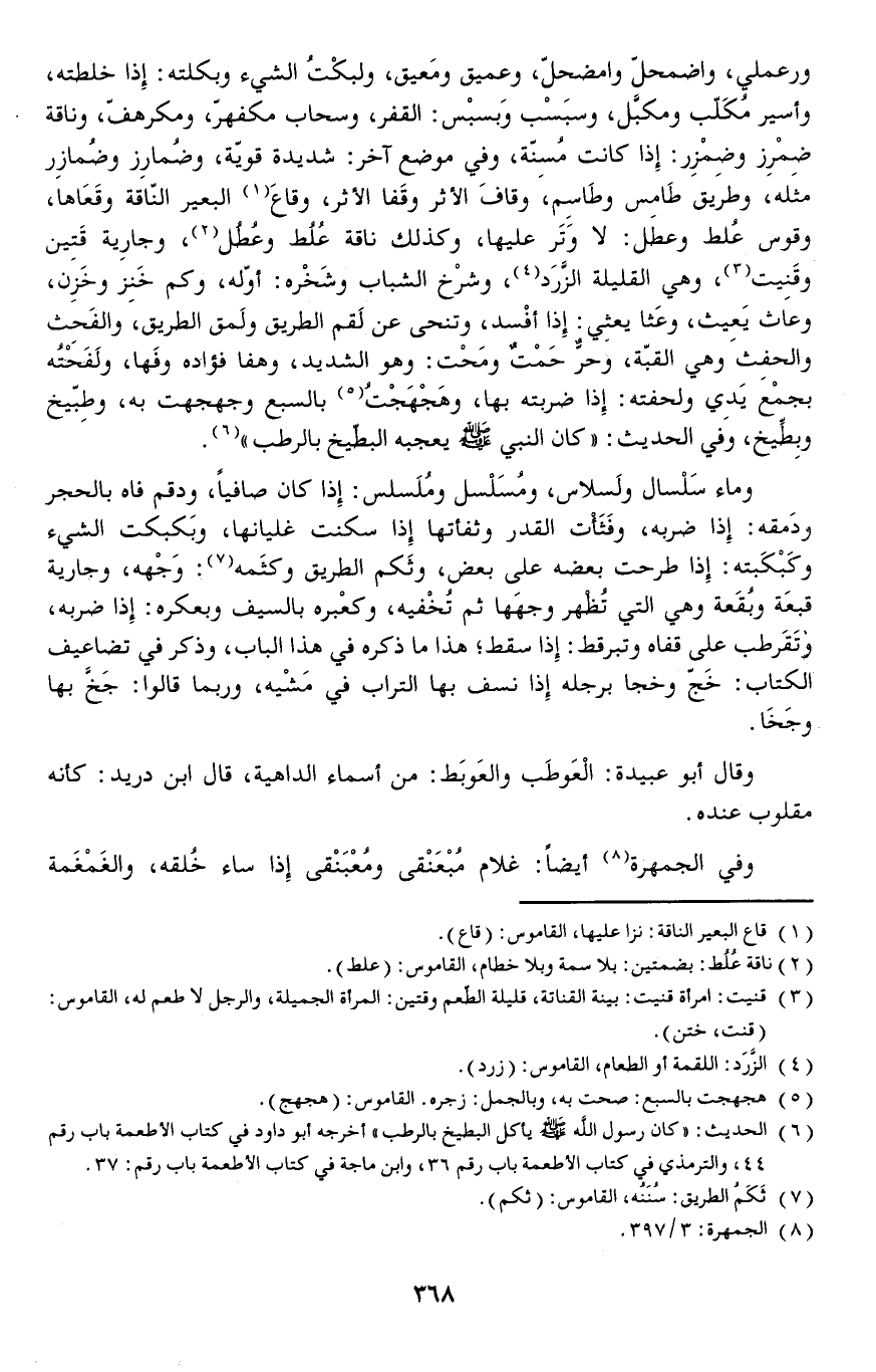 ورعملي واضمحل وامضحل وعميق ومَعيق ولبكْتُ الشيء وبكلته: إذا خلطته وأسير مُكَلّب ومكبَّل وسبَسْب وبسبس: القفر وسحاب مكفهر ومكرهف وناقة ضِمْرِز وضِمْزِر: إذا كانت مسنة وفي موضع آخر: شديدة قوية وضمارز وضُمازِر مثله وطريق طَامِس وطَاسِم وقافَ الأثر وقَفا الأثر وقاعَ البعير الناقة وقَعَاها وقوس عُلط وعطل: لا وَتَر عليها وكذلك ناقة عُلُط وعُطُل وجارِية قَتِين وقَنِيت وهي القليلة الزَّرد وشرْخ الشباب وشَخْره: أوله وكم خَنزِ وخَزِن وعاث يَعِيث وعَثا يعثِي: إذا أفْسد وتنحى عن لَقم الطريق ولَمق الطريق والفَحِث والحفِث وهي القبة وحرٌّ حَمْتٌ ومَحْت: وهو الشديد وهفا فؤاده وفَها ولَفَحْتُه بجمْع يَدِي ولحفته: إذا ضربته بها وهَجْهَجْتُ بالسبع وجهجهت به وطِبّيخ وبِطِّيخ وفي الحديث: (كان النبي صلى الله عليه وسلم يعجبه البطيخ بالرطب) .