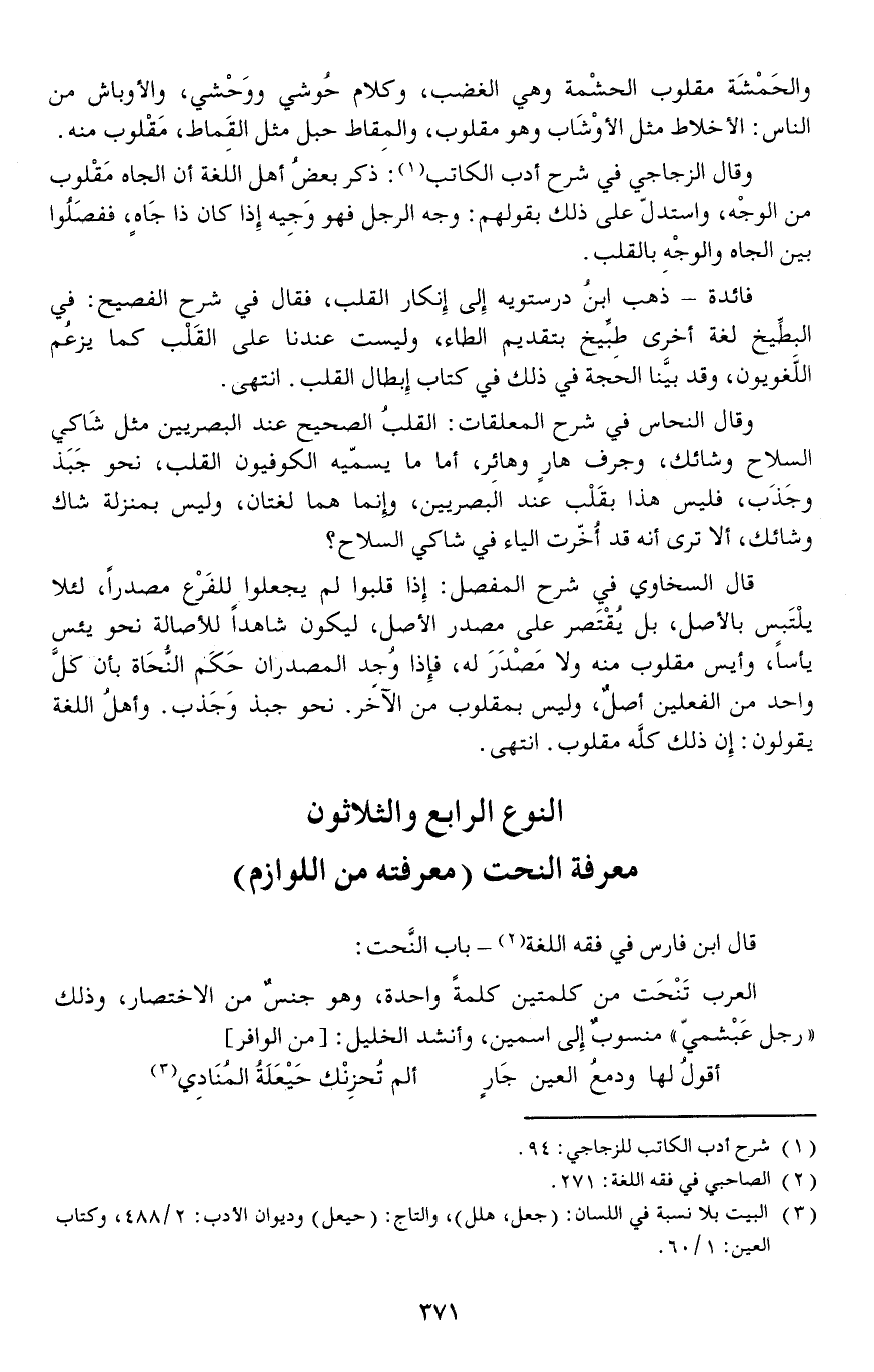وقال النحاس في شرح المعلقات: القلبُ الصحيح عند البصريين مثل شَاكي السلاح وشائك وجرف هارٍ وهائِر أما ما يسميه الكوفيون القلب نحو جَبَذ وجَذَب فليس هذا بقَلْب عند البصريين وإنما هما لغتان وليس بمنزلة شاك وشائك ألا ترى أنه قد أُخّرت الياء في شاكي السلاح