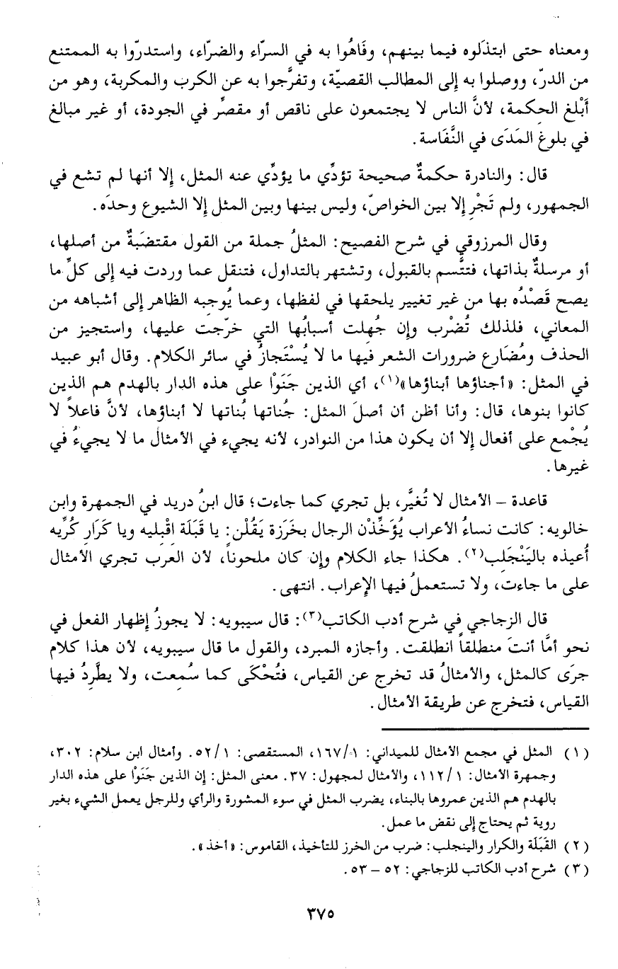 وقال المرزوقي في شرح الفصيح: المثلُ جملة من القول مقتضَبةٌ من أصلها أو مرسلةٌ بذاتها فتتسم بالقبول وتشتهر بالتداول فتنقل عما وردت فيه إلى كلِّ ما يصح قَصْدُه بها من غير تغيير يلحقها في لفظها وعما يُوجِبه الظاهر إلى أشباهه من المعاني فلذلك تُضْرب وإن جُهِلت أسبابُها التي خرجت عليها واستجيز من الحذف ومُضَارع ضرورات الشعر فيها ما لا يُسْتَجازُ في سائر الكلام.