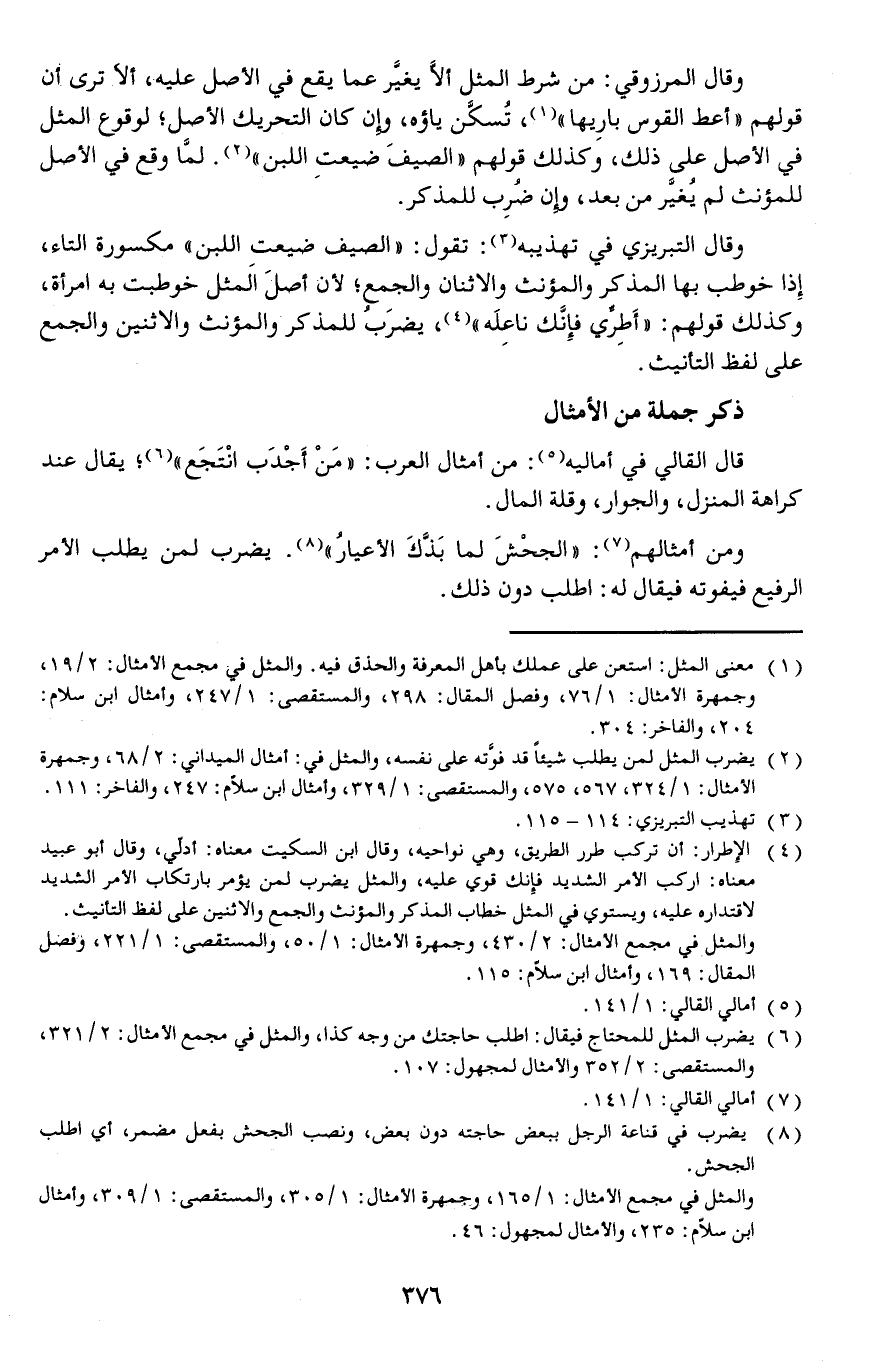 وقال المرزوقي: من شرط المثل ألاَّ يغيَّر عما يقع في الأصل عليه ألاَ ترى أن قولهم (أعط القوس بارِيها) تُسكَّن ياؤه وإن كان التحريك الأصللوقوع المثل في الأصل على ذلك وكذلك قولهم (الصيفَ ضيعتِ اللبن) .
