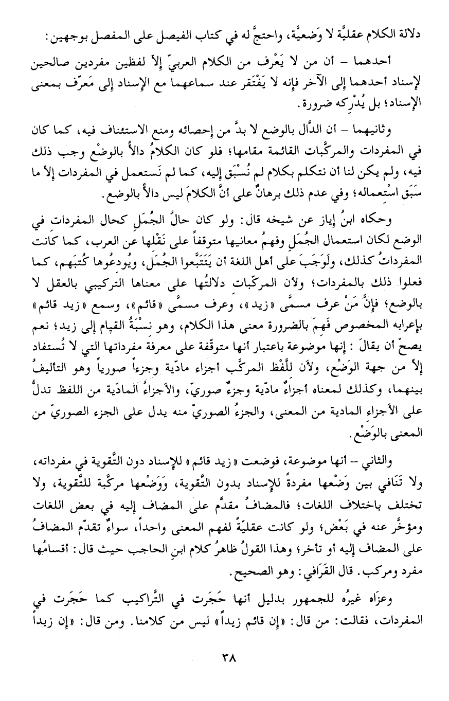 وحكاه ابنُ إياز عن شيخه قال: ولو كان حالُ الجُمَلِ كحال المفرداتِ في الوضع لكان استعمال الجمل وفهم معانيها متوقفا على نقلها عن العرب كما كانت المفردات كذلك ولوجب على أهل اللغة أن يتتبعوا الجمل ويُودِعُوها كُتبَهم كما فعلوا ذلك بالمفردات ولأن المركّباتِ دلالتُها على معناها التركيبي بالعقل لا بالوضع فإنَّ مَنْ عرف مسمَّى (زيد) وعرف مسمَّى (قائم) وسمع (زيد قائم) بإعرابه المخصوص فَهِمَ بالضرورة معنى هذا الكلام وهو نِسْبَةُ القيام إلى زيد نعم يصح أن يقالَ: إنها موضوعة باعتبار أنها متوقفة على معرفة مفرداتها التي لا تُستفاد إلا من جهة الوَضْع ولأَن لِلَّفْظ المركَّب أجزاء مادية وجزءا صوريا وهو التأليفُ بينهما وكذلك لمعناه أجزاءٌ مادية وجزءٌ صوري والأَجزاءُ المادية من اللفظ تدلُّ على الأَجزاءِ المادية من المعنى والجزءُ الصوري منه يدل على الجزء الصوري من المعنى بالوَضْع.