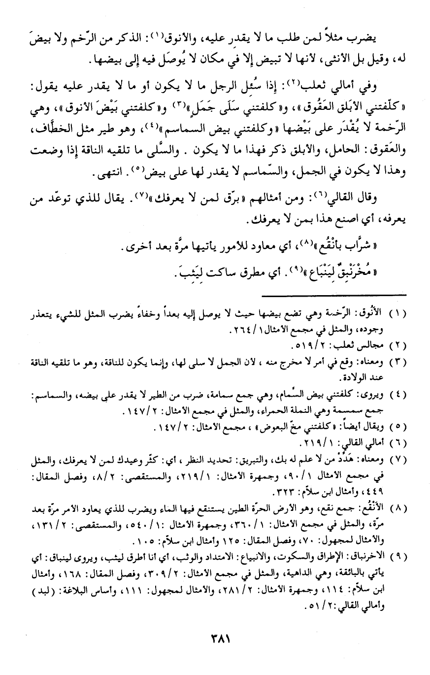 وفي أمالي ثعلب: إذا سُئِل الرجل ما لا يكون أو ما لا يقدر عليه يقول: (كلفتني الأبلق العقوق) و (كلفتني سلى جمل) و (كلفتني بَيْضَ الأنوق) وهي الرخمة لا يُقْدَر على بَيْضها (وكلفتني بيض السماسم) وهو طير مثل الخطَاف والعَقوق: الحامل والأبلق ذكر فهذا ما لا يكون.