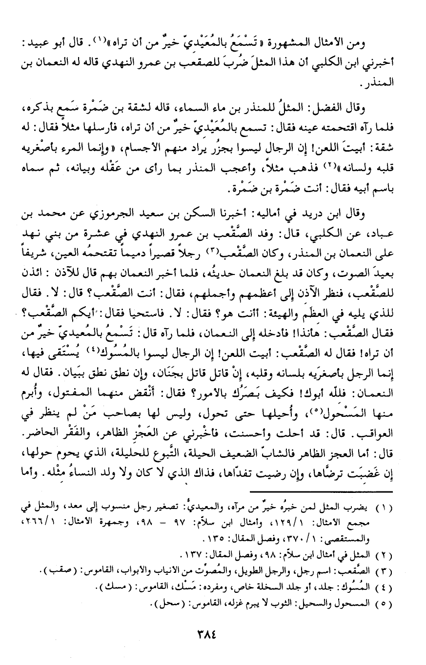 فاستحيا فقال: أيكم الصقعبفقال الصقعب: هأنذافأدخله إلى النعمان فلما رآه قال: تَسْمعُ بالمُعيديّ خير من أن تراهفقال له الصقعب: أبيت اللعنإن الرجال ليسوا بالمُسُوك يُسْتَقى فيها إنما الرجل بأصغرَيه بلسانه وقلبه إنْ قاتل قاتل بجَنَان وإن نطق نطق ببَيان.
