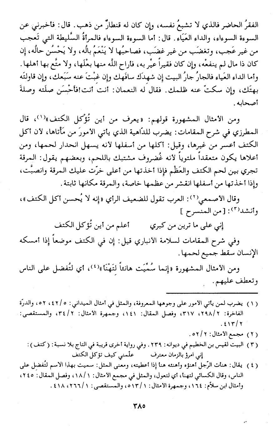 ومن الأمثال المشهورة قولهم: (يعرف من أين تُؤْكل الكتف) قال المطرزي في شرح المقامات: يضرب للداهية الذي يأتي الأمور من مأتاه الأن أكل الكتف أعسر من غيرها وقيل: أكلها من أسفلها لأنه يسهل انحدار لحمها ومن أعلاها يكون متعقدا ملتويا لأنه غُضروف مشتبك باللحم وبعضهم يقول: المرقة تجري بين لحم الكتف والعَظْم فإذا أخذتها من أعلى خرت عليك المرقة وانصبتو إذا أخذتها من أسفلها انقشر من عظمها خاصة والمرقة مكانها ثابتة.