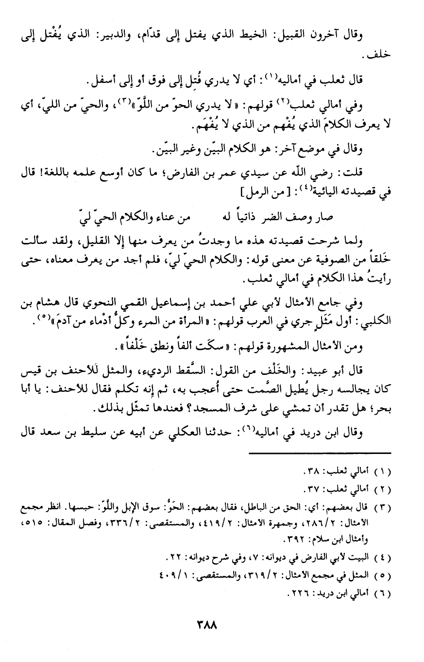 وفي أمالي ثعلب قولهم: (لا يدري الحو من اللَّوّ) والحي من اللي أي لا يعرف الكلامَ الذي يُفْهم من الذي لا يُفْهَم.