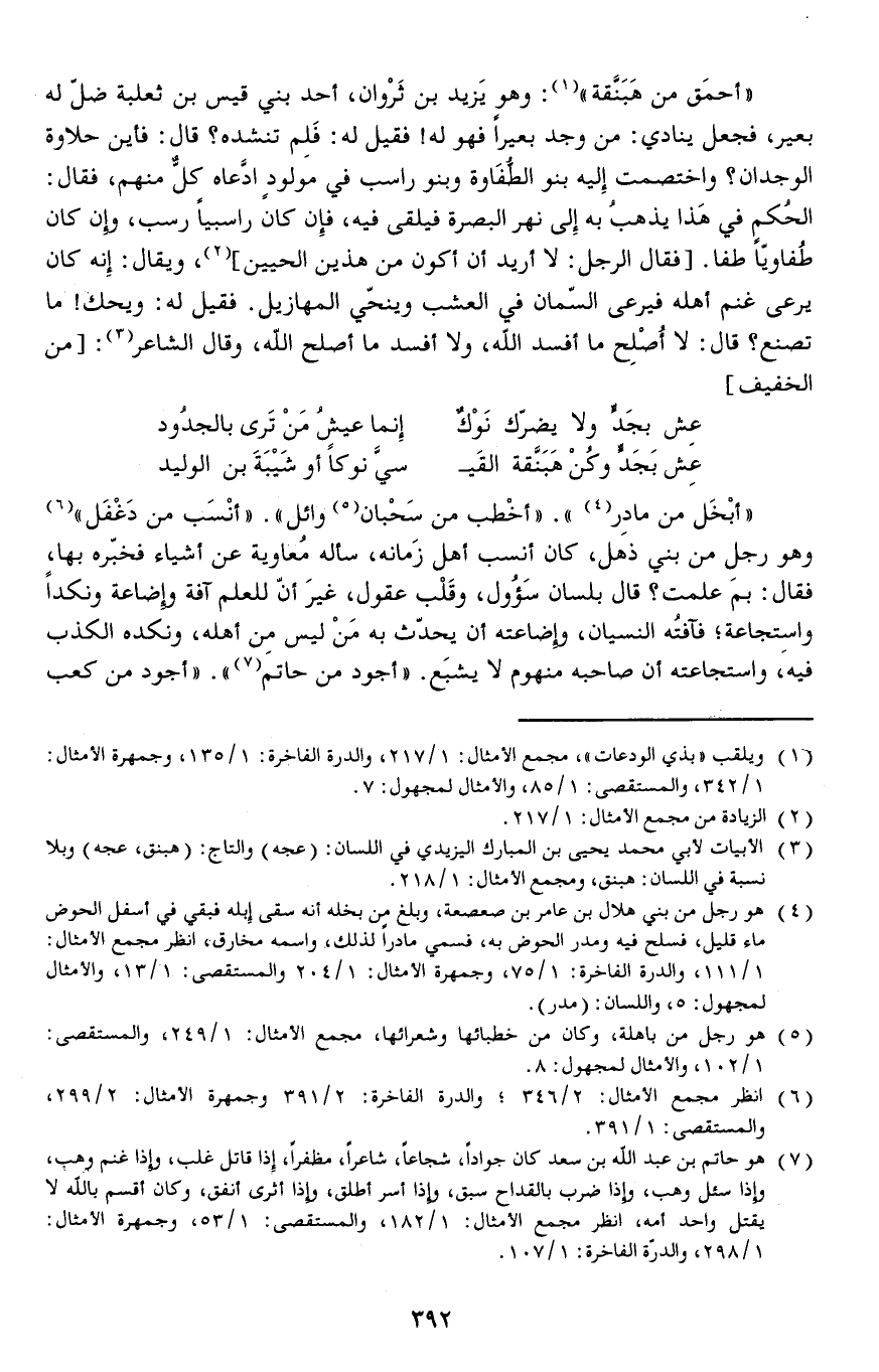 (أحمَق من هَبّنقة) : وهو يَزيد بن ثَرْوان أحد بني قيس بن ثعلبة ضل له بعير فجعل ينادي: من وجد بعيرا فهو لهفقيل له: فلم تنشدهقال: فأين حلاوة الوجدان. واختصمت إليه بنو الطُّفَاوة وبنو راسب في مولودٍ ادَّعاه كلٌّ منهم فقال: الحُكم في هَذا يذهبُ به إلى نهر البصرة فيلقى فيهفإن كان راسبيا رسب وإن كان طُفاويّاً طفا.