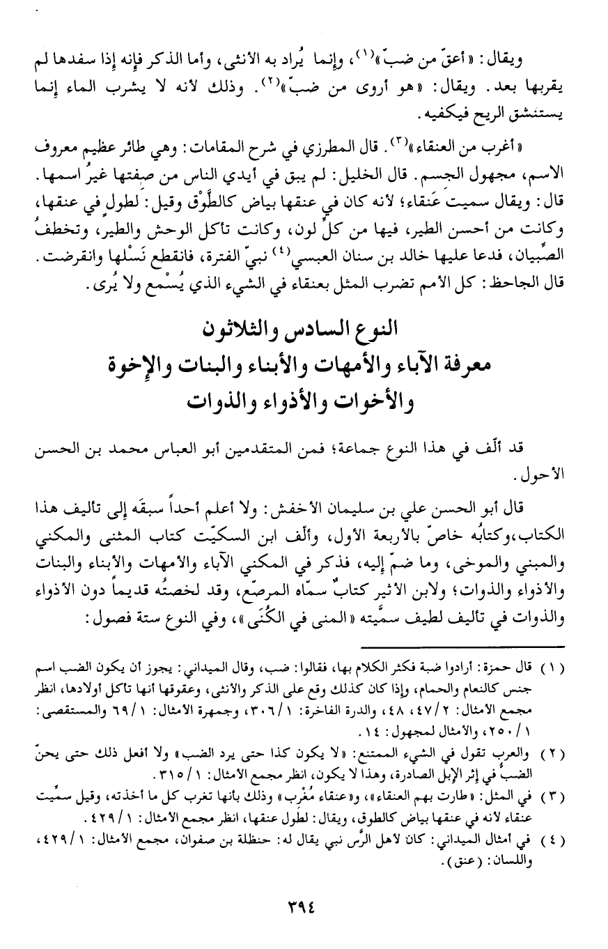 قال أبو الحسن علي بن سليمان الأخفش: ولا أعلم أحدا سبقَه إلى تأليف هذا الكتاب وكتابه خاص بالأربعة الأول وألف ابن السكيت كتاب المثنى والمكنى والمبني والموخى وما ضم إليه فذكر في المكني الآباء والأمهات والأبناء والبنات والأذواء والذواتولابن الأثير كتابٌ سماه المرصع وقد لخصتُه قديما دون الأذواء والذوات في تأليف لطيف سميته (المنى في الكُنَى) وفي النوع ستة فصول: