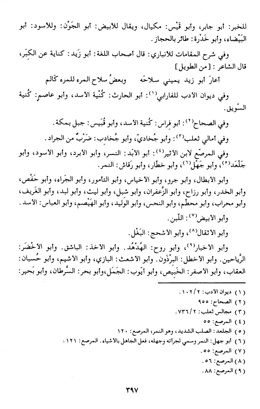 وأبو الأشعث: البازي وأبو الأشيم وأبو حُسبان: العقاب وأبو الأصفر: الخَبِيص وأبو أيوب: الجَمَل وأبو بحر: السَّرطان وأبو بَحير: