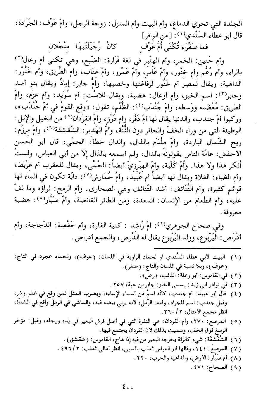 وأم حَنِين: الخمر وأم الهِنْبِر في لغة فَزَارة الضبع: وهي تكنى أم رعال بالراءوأم رُعْم وام خِنَّور وأم عَامرٍ وأم عَمْرو وأم عِتَاب وأم الطَّريق وأم خَنُّوْر: الداهية ويقال لمصر أم خَنُّور لرفاغتها وخصبها وأمُّ جابر: إياد ويقال بنو أسد وجابر: اسم الخبر وأم أوعال: هضبة ويقال للاسْتِ: أم سُوَيد وأم عزم وأم الطريق: مع ظمه وزسطه وأم جُنْدَب: الظُّلْم تقول: (وقع القومُ في أم جندب) وركبوا أم جندب والدنيا يقال لها أم دَفْر وأم دَرْزٍ وأم القِرْدان من الخيل والإبل: الوطيئة التي من وراء الخف والحافر دون الثُّنَّة وأم الهَدِير: الشقشقة وأم مِرزَم: ريح الشمال الباردة وأم مِلْذَم بالذال والدال خطا: الحمى قال أبو الحسن الأخفش: عامة الناس يقولونه بالدال ولم أسمعه بالذال إلا من أبي العباس ولستُ أُنكر هذا ولا هذا.