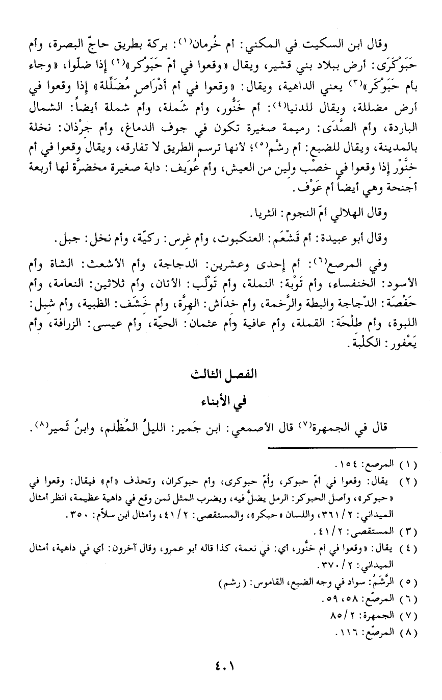وقال ابن السكيت في المكني: أم خُرمان: بركة بطريق حاج البصرة وأم حبوكري: أرض ببلاد بني قشير ويقال (وقعوا في أم حَبَوْكر) إذا ضلوا (وجاء بأم حَبَوْكَر) يعني الداهية ويقال: (وقعوا في أم أَدْرَاصٍ مُضَلِّلة) إذا وقعوا في أرض مضللة ويقال للدنيا: أم خَنُّور وأم شَملة وأم شملة أيضا: الشمال الباردة وأم الصَّدَى: رميمة صغيرة تكون في جوف الدماغ وأمِ جِرْذان: نخلة بالمدينة ويقال للضبع: أم رشملأنها ترسم الطريق لا تفارقه ويقال وقعوا في أم خِنَّوْر إذا وقعوا في خصْب ولِين من العيش وأم عُوَيف: دابة صغيرة مخضرَّة لها أربعة أجنحة وهي أيضا أم عَوْف.