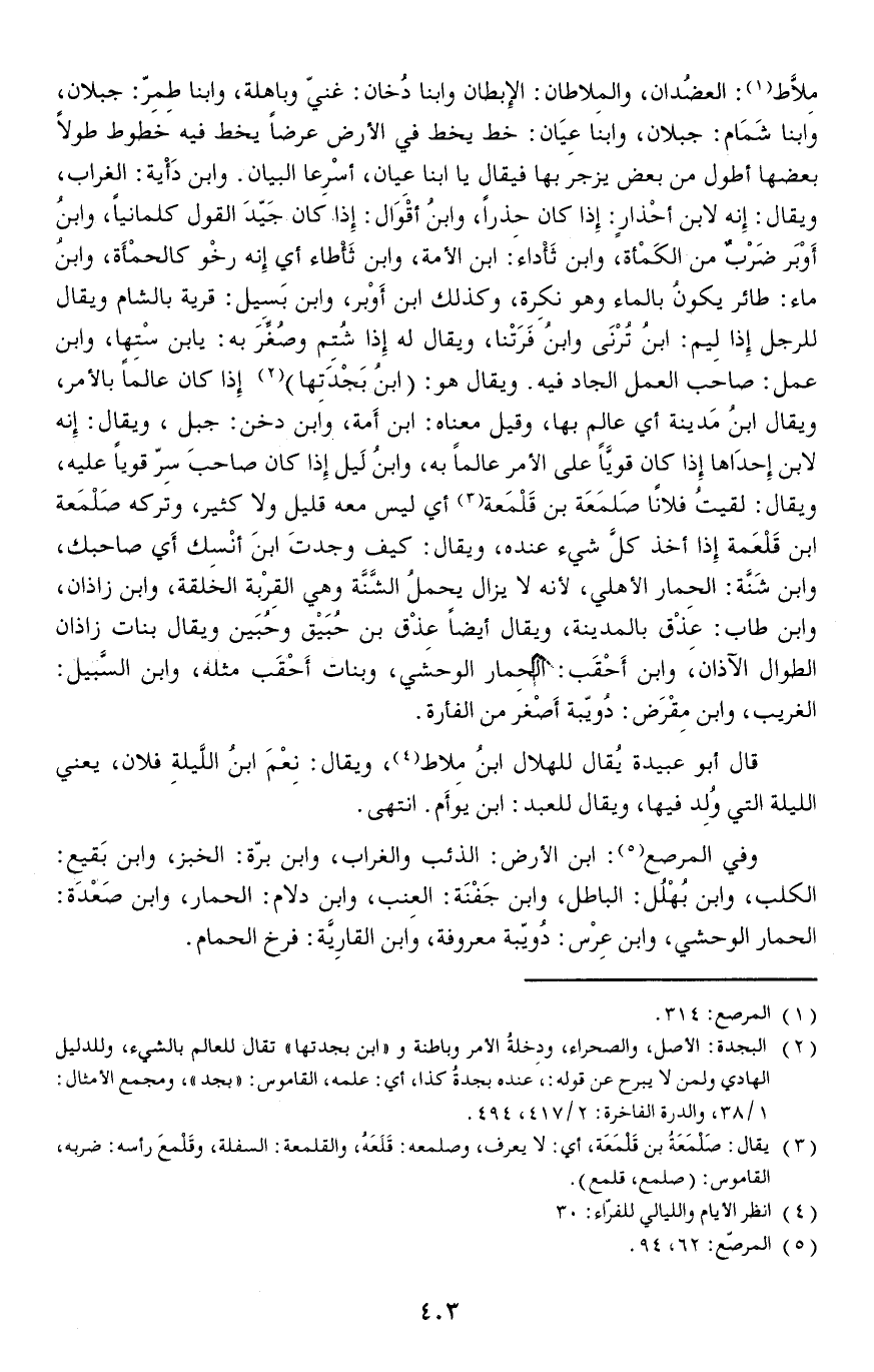 ويقال هو: (ابنُ بَجْدَتِها) إذا كان عالما بالأمر ويقال ابنُ مَدينة أي عالم بها وقيل معناه: ابن أَمة وابن دخن: جبل ويقال: إنه لابن إحدَاها إذا كان قويَّاً على الأمر عالما به وابنُ لَيل إذا كان صاحبَ سِرّ قويا عليه ويقال: لقيتُ فلانا صَلمَعَة بن قَلْمَعة أي ليس معه قليل ولا كثير وتركه صَلْمَعة ابن قَلْعَمة إِذا أخذ كلَّ شيء عنده وقال كيف وجدتَ ابنَ أنْسِك أَي صاحبك وابن شَنَّة: الحِمار الأهلي لأنه لا يزال يحملُ الشَّنَّة وهي القِرْبة الخلقة وابن زاذان وابن طاب: عِذْق بالمدينة ويقال أيضا عِذْق بن حُبَيْق وحُبَين ويقال بنات زاذان الطوال الآذان وابن أَحْقَب: الحِمار الوحشي وبنات أَحْقَب مثله وابن السَّبيل: الغريب وابن مِقْرَض: دُويّبة أَصْغر من الفأرة.