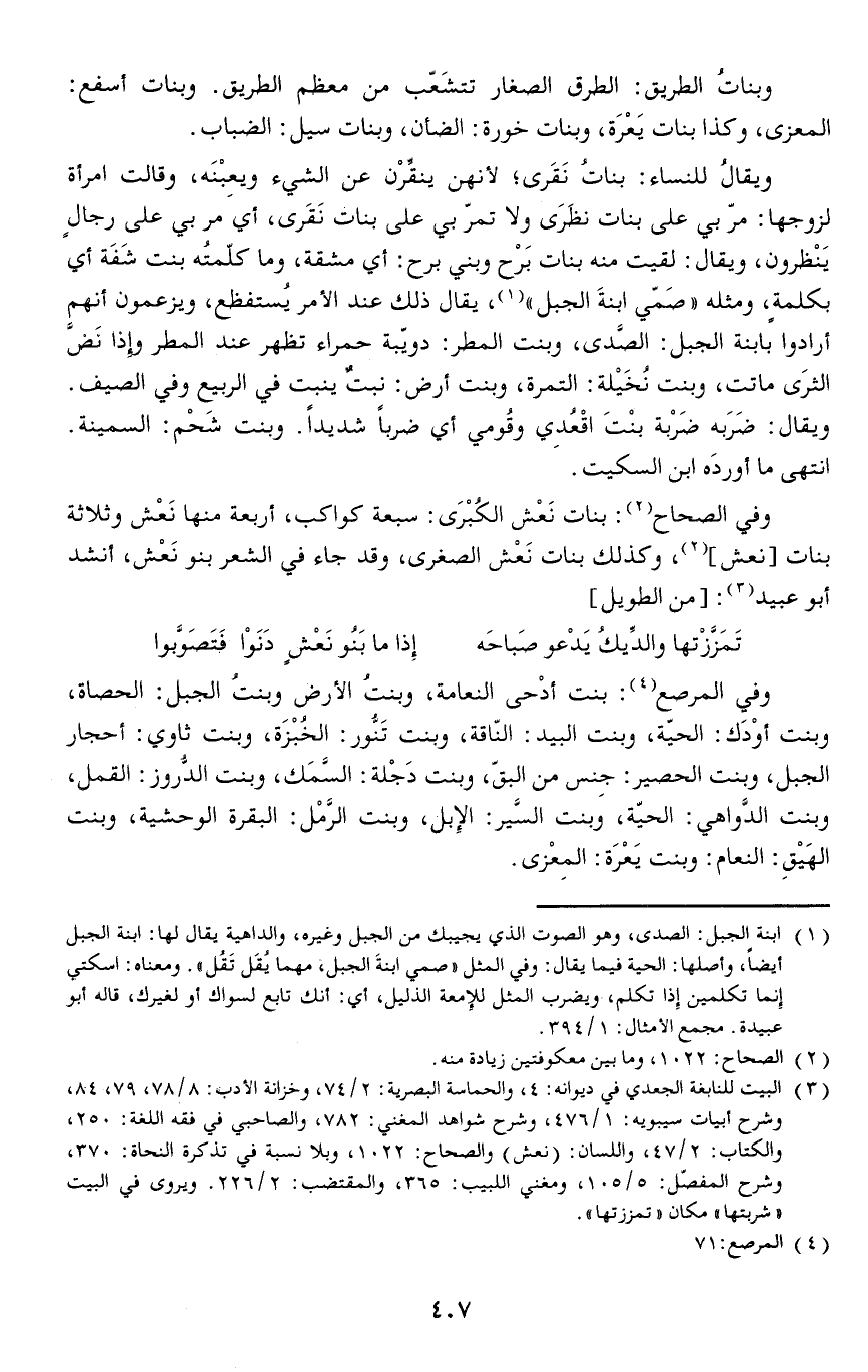 ويقالُ للنساء: بناتُ نَقَرى لأنهن ينقِّرْن عن الشيء ويعِبْنَه وقالت امرأة لزوجها: مر بي على بنات نظَرَى ولا تمر بي على بنات نَقَرى أي مر بي على رجالٍ يَنْظرون ويقال: لقيت منه بنات بَرْح وبني برح: أي مشقة وما كلّمتُه بنت شَفَة أي بكلمةٍ ومثله (صَمّي ابنةَ الجبل) يقال ذلك عند الأمر يُستفظع ويزعمون أنهم أرادوا بابنة الجبل: الصَّدى وبنت المطر: دويبة حمراء تظهر عند المطر وإذا نَضَّ الثرَى ماتت وبنت نُخَيْلة: التمرة وبنت أرض: نبتٌ ينبت في الربيع وفي الصيف.