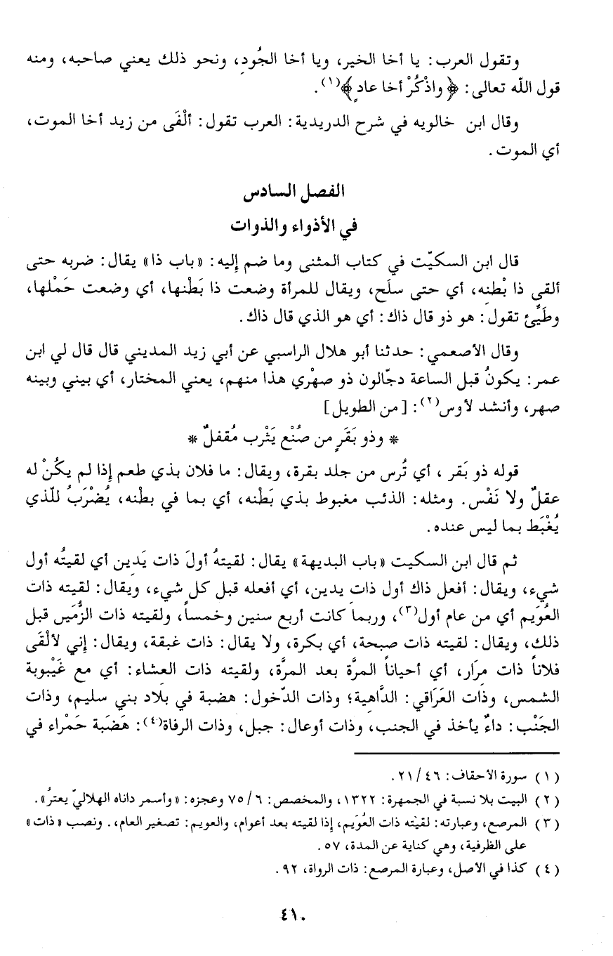 ثم قال ابن السكيت (باب البديهة) يقال: لقيتهُ أولَ ذات يَدِين أي لقيته أول شيءويقال: أفعل ذاك أول ذاتِ يدين أي أفعله قبل كل شيءويقال لقيته ذات العُوَيم أي من عام أول وربما كانت أربع سنين وخمساولقيته ذات الزُّمَين قبل ذلك ويقال: لقيته ذات صبحة أي بكرة ولا يقال: ذات غبقة ويقال: إني لألْقَى فلانا ذات مِرَار أي أحيانا المرَّة بعد المرَّة ولقيته ذات العِشاء: أي مع غَيْبوبة الشمس وذات العَرَاقي: الدَّاهِية وذات الدخول: هضبة في بلا بني سليم وذات الجَنْب: داءٌ يأخذ في الجنب وذات أوعال: جبل وذات الرفاة: هَضَبة حمراء في