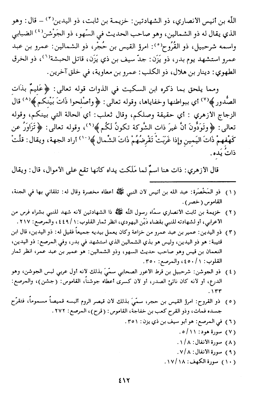 الله بن أنيس الأنصاري ذو الشهادتين: خزيمة بن ثابت ذو اليدين - قال: وهو الذي يقال له ذو الشمالين وهو صاحب الحديث في السهوذو الجَوْشن الضبابي واسمه شرحبيل ذو القُرُوح امرؤ القيس بن حُجْر ذو الشمالين: عمرو بن عبد عمرو استشهد يوم بدر ذو يَزَن: جد سيف بن ذي يَزَن قاتل الحبشة ذو الخرق الطهوي: دينار بن هلال ذو الكلب: عمرو بن معاوية في خلق آخرين.