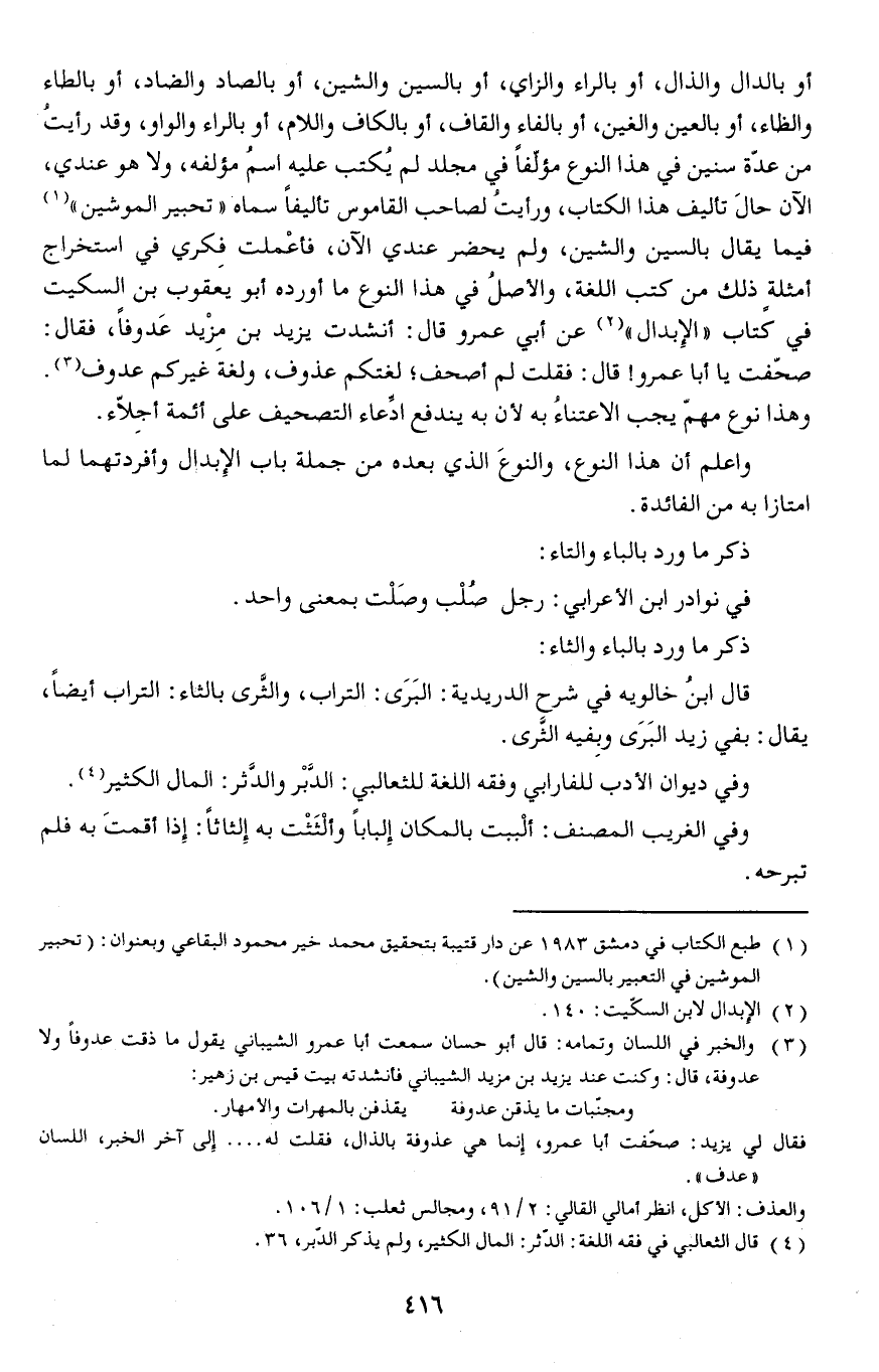 أو بالدال والذال أو بالراء والزاي أو بالسين والشين أو بالصاد والضاد أو بالطاء والظاء أو بالعين والغين أو بالفاء والقاف أو بالكاف واللام أو بالراء والواو وقد رأيتُ من عدة سنين في هذا النوع مؤلفا في مجلد لم يُكتب عليه اسمُ مؤلفه ولا هو عندي الآن حالَ تأليف هذا الكتاب ورأيتُ لصاحب القاموس تأليفا سماه (تحبير الموشين) فيما يقال بالسين والشين ولم يحضر عندي الآن فأعلمت فِكري في استخراج أمثلةٍ ذلك من كتب اللغة والأصلُ في هذا النوع ما أورده أبو يعقوب بن السكيت في كتاب (الإبدال) عن أبي عمرو قال: أنشدت يزيد بن مزيد عدوفا فقال: صحفت يا أبا عمروقال: فقلت لم أصحفلغتكم عذوف ولغة غيركم عدوف.