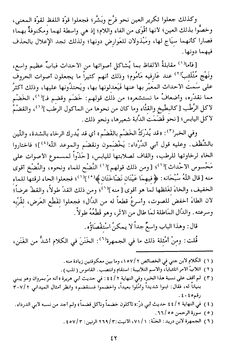 (فأما مقابلةُ الألفاظ بما يُشاكل أصواتها من الأحداث فبابٌ عظيم واسع ونَهْج مُتْلَئِبّ عند عَارِفيه مَأمُوم وذلك أنهم كثيرا ما يجعلون أصوات الحروف على سَمت الأحداث المعبر بها عنها فَيَعدِلونها بها ويَحتذُونها عليها وذلك أكثرُ مما نقدره وأضعافُ ما نستشعره من ذلك قولهم: خَضَم وقضِم ف) الخَضْم لأكل الرَّطْب (كالبِطّيخِ والقِثَّاء وما كان من نحوها من المأكول الرطب) والقضْمُ لأكل اليابس (نحو قَضَمَت الدَّابة شعيرها ونحو ذلك.