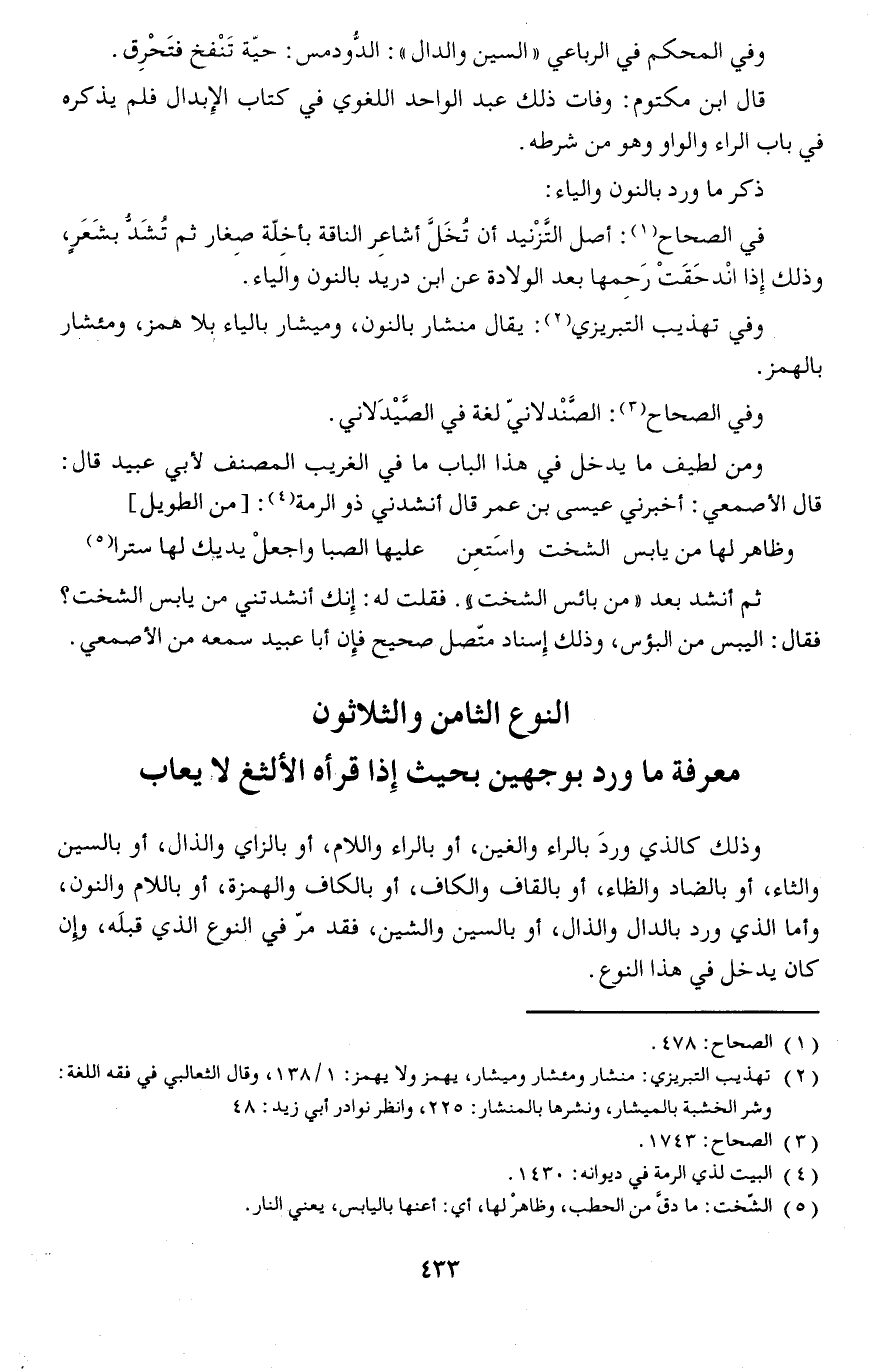 وذلك كالذي وردَ بالراء والغين أو بالراء واللام أو بالزاي والذال أو بالسين والثاء أو بالضاد والظاء أو بالقاف والكاف أو بالكاف والهمزة أو باللام والنون وأما الذي ورد بالدل والذال أو بالسين والشين فقد مر في النوع الذي قبلَه وإن كان يدخل في هذا النوع.
