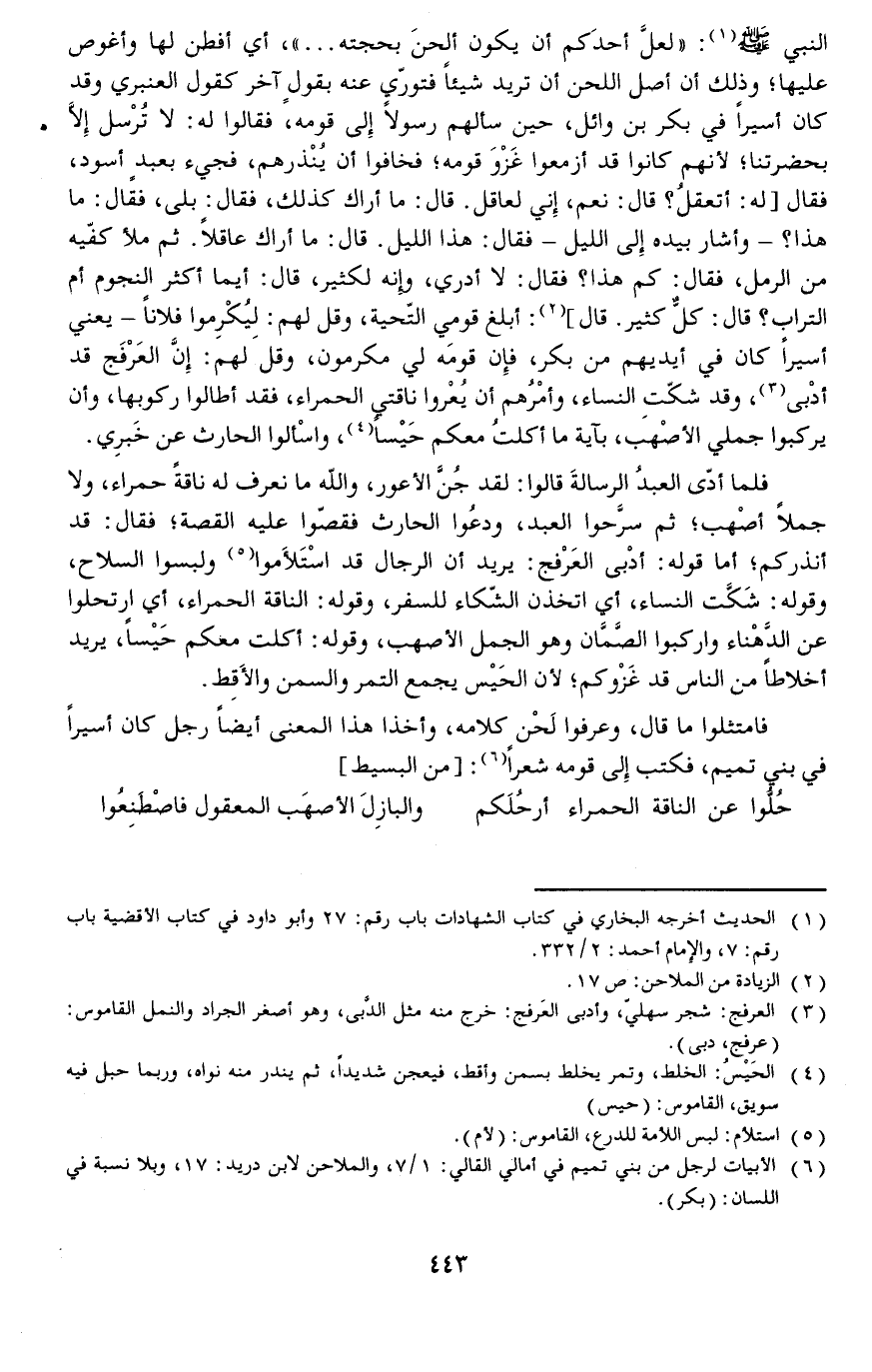 النبي صلى الله عليه وسلم: (لعلَّ أحدَكم أن يكون ألحن بحجته ... ) أي أفطن لها وأغوص عليهاوذلك أن أصل اللحن أن تريد شيئا فتوري عنه بقولٍ آخر كقول العنبري وقد كان أسيرا في بكر بن وائل حين سألهم رسولا إلى قومه فقالوا له: لا تُرْسل إلا بحضرتنالأنهم كانوا قد أزمعوا غزو قومهفخافوا أن يُنْذرهم فجىء بعبدٍ أسود فقال (له: أتعقلقال: نعم إني لعاقل: ما أراك كذلك فقال: بلى فقال: ما هذا - وأشار بيده إلى الليل - فقال: هذا الليل.