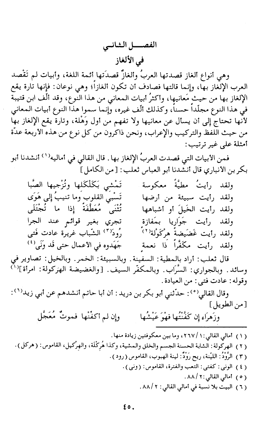 وهي أنواع ألغاز قصدتها العربُ وألغازٌ قصدَتها أئمة اللغة وأبيات لم تَقْصد العرب الإلغاز بها وإنما قالتها فصادف أن تكون ألغازاوهي نوعان: فإنها تارة يقع الإلغاز بها من حيث مَعانيها وأكثرُ أبيات المعاني من هذا النوع وقد ألف ابن قتيبة في هذا النوع مجلدا حسناوكذلك ألف غيره وإنما سموا هذا النوع أبيات المعاني لأنها تحتاج إلى أن يسأل عن معانيها ولا تفهم من أول وَهْلة وتارة يقع الإلغاز بها من حيث اللفظ والتركيب والإعراب ونحن ذاكرون من كل نوع من هذه الأربعة عدة أمثلة على غير ترتيب: