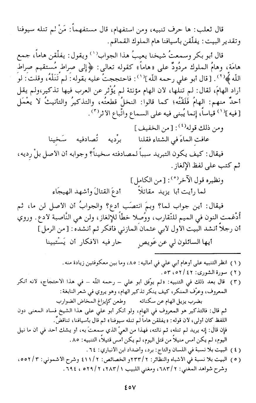 (قال أبو علي رحمه الله: فاحتججتُ عليه بقوله: لم تَنَلْهُ وقلت: لو أراد الهامَ لقال: لم تنلها لأن الهام مؤنثة لم يُؤْثر عن العرب فيها تذكير ولم يقل أحدٌ منهم: الهامُ فَلَقْتُه كما قالوا: النخلُ قطعتُه والتذكير والتأنيث لا يعمل (فيه) قياساإنما يُبنى فيه على السماع واتِّباع الأثر.