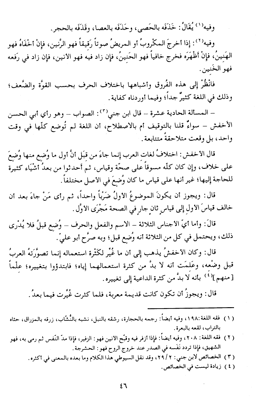 - المسألة الحادية عشرة - قال ابن جني: الصواب - وهو رأي أبي الحسن الأَخفش - سواءٌ قلنا بالتوقيف أم بالاصطلاح أن اللغة لم تُوضع كلها في وقت واحد بل وقعت متلاحقة متتابعة.
