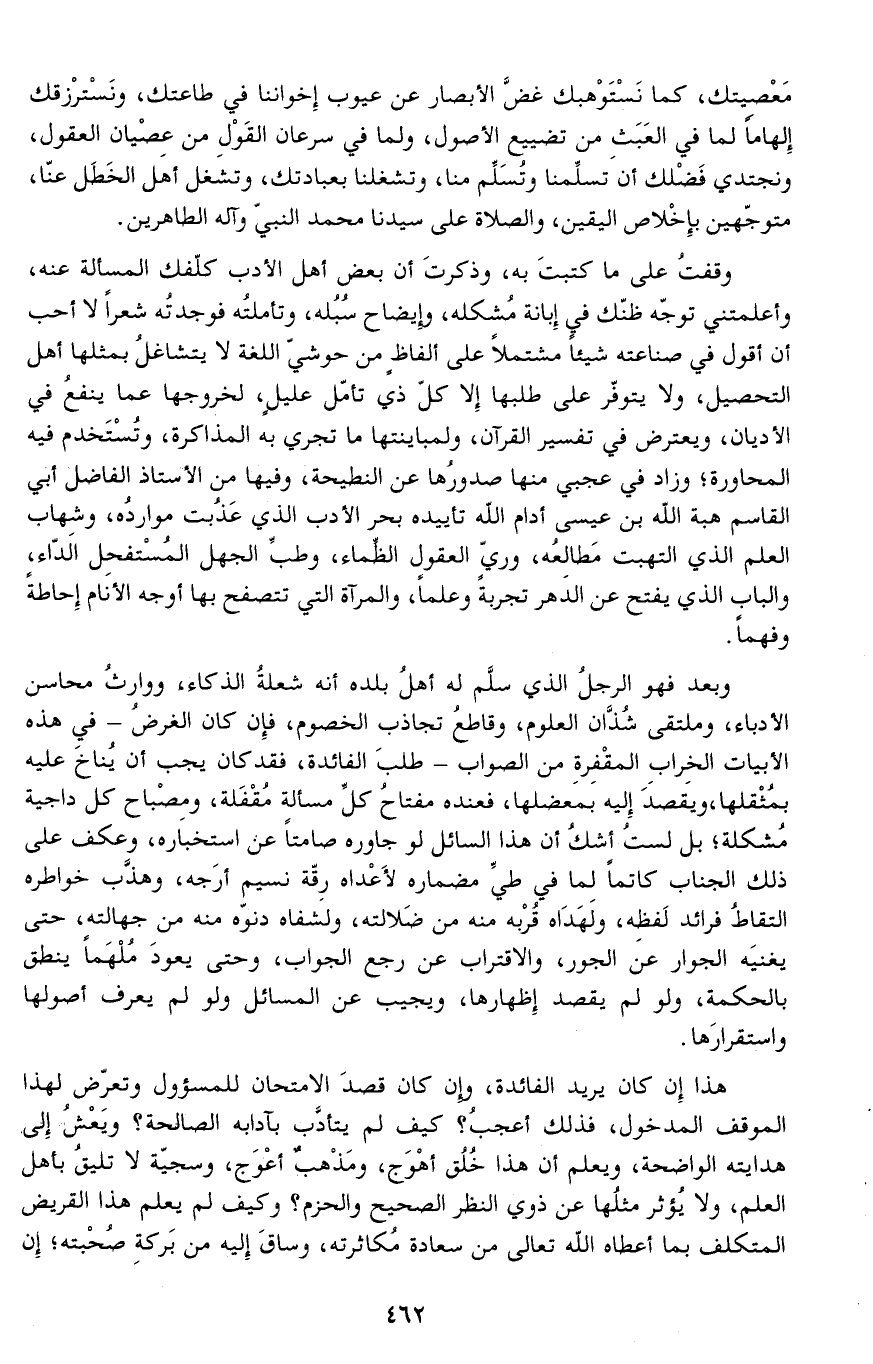 وبعد فهو الرجلُ الذي سلَّم له أهلُ بلده أنه شعلة الذكاءووارث محاسن الأدباءوملتقى شُذَّان العلوم وقاطعُ تجاذب الخصوم فإن كان الغرضُ - في هذه الأبيات الخِرابِ المقْفِرةِ من الصواب - طلبَ الفائدة فقد كان يجب أن يُناخَ عليه بمُثْقلها ويقصدَ إليه بمعضلها فعنده مفتاحُ كلِّ مسألة مُقْفَلة ومِصْباح كل داجية مُشكلة بل لستُ أشكُ أن هذا السائل لو جاوره صامتا عن استخباره وعكف على ذلك الجناب كاتما لِما في طيِّ مضماره لأَعْداه رِقّة نسيم أرَجه وهذَّب خواطره التقاطُ فرائد لَفظِه ولهَدَاه قُرْبه منه من ضَلالته ولشفاه دنوه منه من جهالته حتى يغنيَه الجوار عن الجور والاقتراب عن رجع الجواب وحتى يعودَ مُلْهَماً ينطق بالحكمة ولو لم يقصد إظهارها ويجيب عن المسائل ولو لم يعرف أصولها واستقرارَها.