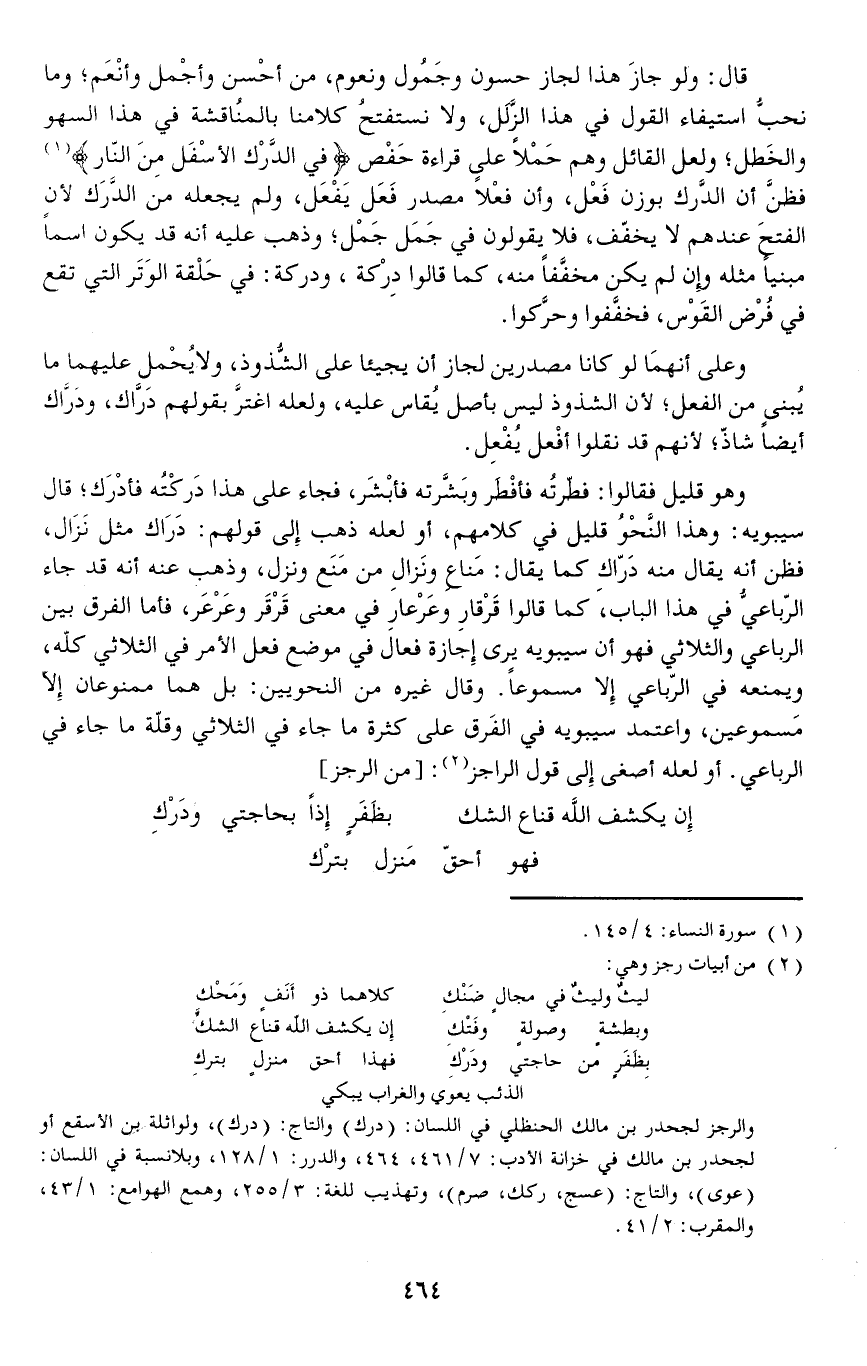 قال: ولو جازَ هذا لجاز حسون وجَمُول ونعوم من أحسن وأجمل وأنعموما نحبُّ استيفاء القول في هذا الزَّلَل ولا نستفتح كلامنا بالمناقشة في هذا السهو الخطلولعل القائل وهم حَمْلاً على قراءة حَفْص {في الدَّرْك الأسْفَل مِنَ النار} فظنَّ أن الدَّرك بوزن فَعْل وأن فعْلاً مصدر فَعَل يَفْعَل ولم يجعله من الدَّرَك لأن الفتحَ عندهم لا يخفف فلا يقولون في جمل جملوذهب عليه أنه قد يكون اسما مبنيا مثله وإن لم يكن مخفَّفاً منه كما قالوا دِرْكة ودركة: في حَلْقة الوَتَر التي تقع في فُرْض القَوْس فخفَّفوا وحرَّكوا.