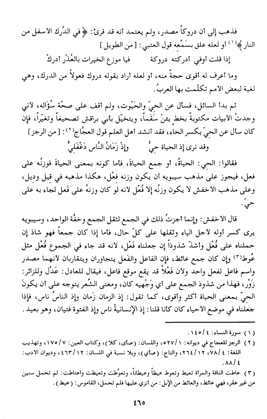 قال الأخفش: وإنما أجزتُ ذلك في الجمع لثقل الجمع وخفَّة الواحد وسيبويه يرى كسر أوله لأجل الياء وثقلها على كل حال فأما إذا كان جمعا فهو شاذ إن حملناه على فُعْل وأشذ شذوذا إن جعلناه فَعْل لأنه قد جاء في الجموع فُعْل مثل عُوط وإن كان جمع عائط فإن الفاعل والفَعل يتجاوران ويتقاربان لأنهما مصدر واسم فاعل لفعل واحد ولأن فَعْلاً قد يقع موقع فاعل فيقال للعادل: عَدْل وللزائر: زورفهذا من شذوذ الجمع على أي وَجْهيه كان ومعنى الشِّعر يتوجه على أن يكونَ الحِيّ بمعنى الحياة أكثر وأقوى كما تقول: إذ الزمان زَمان وإذ الناسُ ناس فإذا جعلناه في موضع الأحياء كان كأنا قلنا: إذ الإنسانيةُ ناس وإذ الفتوة فتيان وهو بعيد.