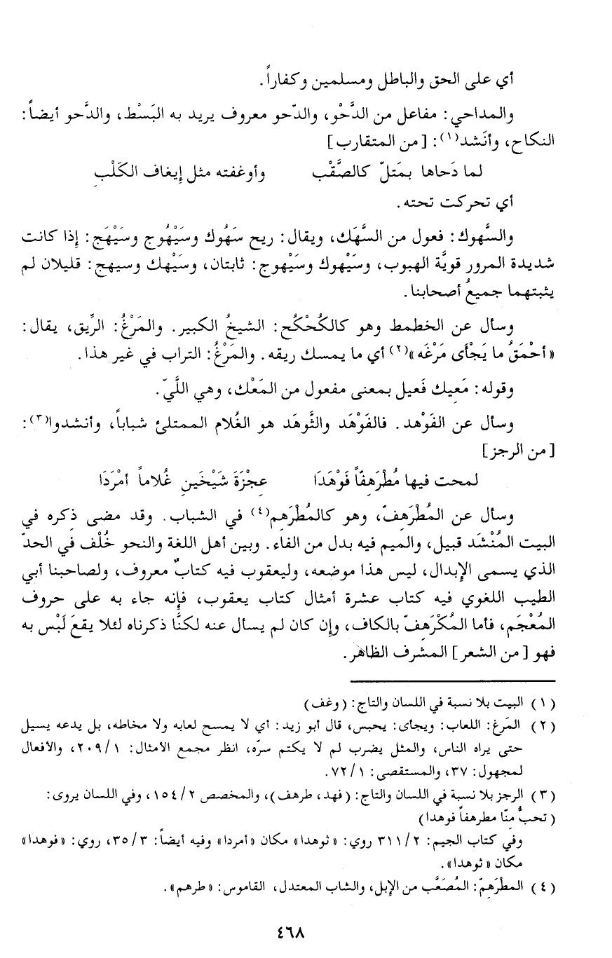 وبين أهل اللغة والنحو خُلْف في الحد الذي يسمى الإبدال ليس هذا موضعه وليعقوب فيه كتابٌ معروف ولصاحبنا أبي الطيب اللغوي فيه كتاب عشرة أمثال كتاب يعقوب فإنه جاء به على حروف المُعْجَم فأما المُكْرَهِفّ بالكاف وإن كان لم يسأل عنه لكنَّا ذكرناه لئلا يقعَ لَبْس به فهو (من الشعر) المشرف الظاهر.