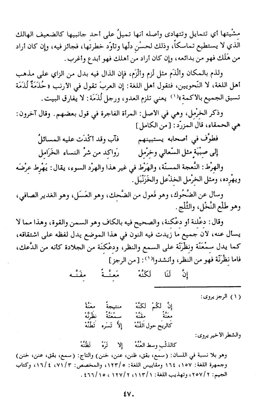 ولذم بالمكان وألْذَم مثل لَزم وألْزَم فإن الذال فيه بدل من الزاي على مذهب أهل اللغة لا النحويين فتقول أهل اللغة: إن العربَ تقول في الأرنب (حُذَمَةٌ لُذَمَة تسبق الجميع بالأكمةِ) يعني تلزم العدو ورجل لُذَمَة: لا يفارق البيت.