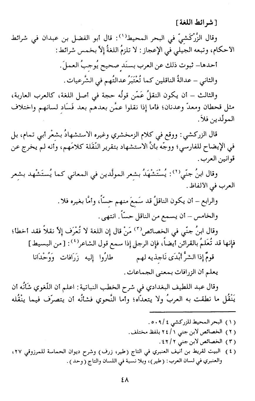 وقال الزَّرْكَشِيّ في البحر المحيط: قال أبو الفضل بن عبدان في شرائط الأحكام وتبعه الجيلي في الإعجاز: لا تلزمُ اللغةُ إلا بخمس شرائط: