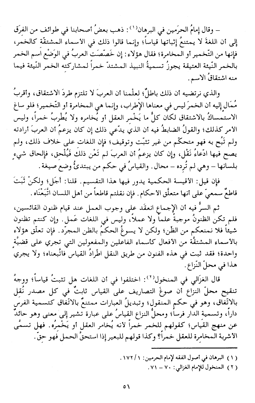 - وقال إمامُ الحرَمين في البرهان: ذهب بعضُ أصحابنا في طوائف من الفِرَق إلى أن اللغةَ لا يمتنعُ إثباتها قياسا وإنما قالوا ذلك في الأسماء المشتقّةِ كالخمر فإنها من التخمير أو المخامرة فقال هؤلاء: إن خَصّصَت العربُ في الوَضْع اسم الخمر بالخمر النيئة العتيقة يجوزُ تسميةُ النبيذ المشتد خمرا لمشاركتِه الخمر النيئة فيما منه اشتقاقُ الاسم.